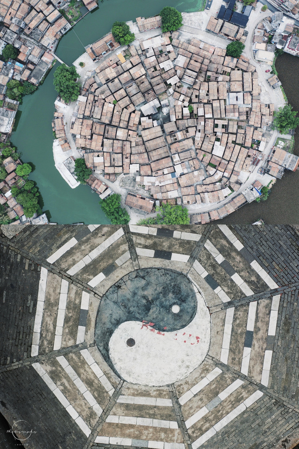 肇庆 的八卦村四周环水,外围被新的建筑包围,距今已经有700多年的历史。无人机航拍,能看到整座村庄在一个圆形的岛上,四面被一条河环绕,小小的村子竟有99条巷道,一层层,一圈圈,重重玄机,皆按风水布局