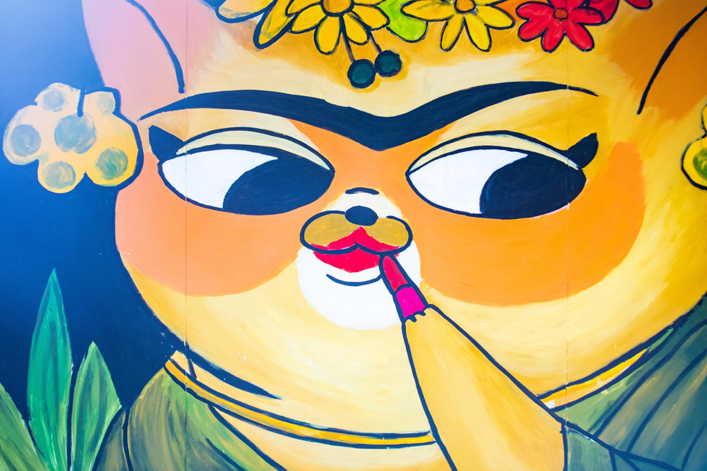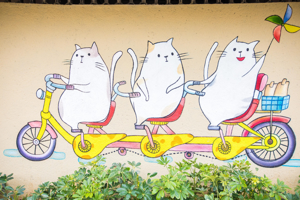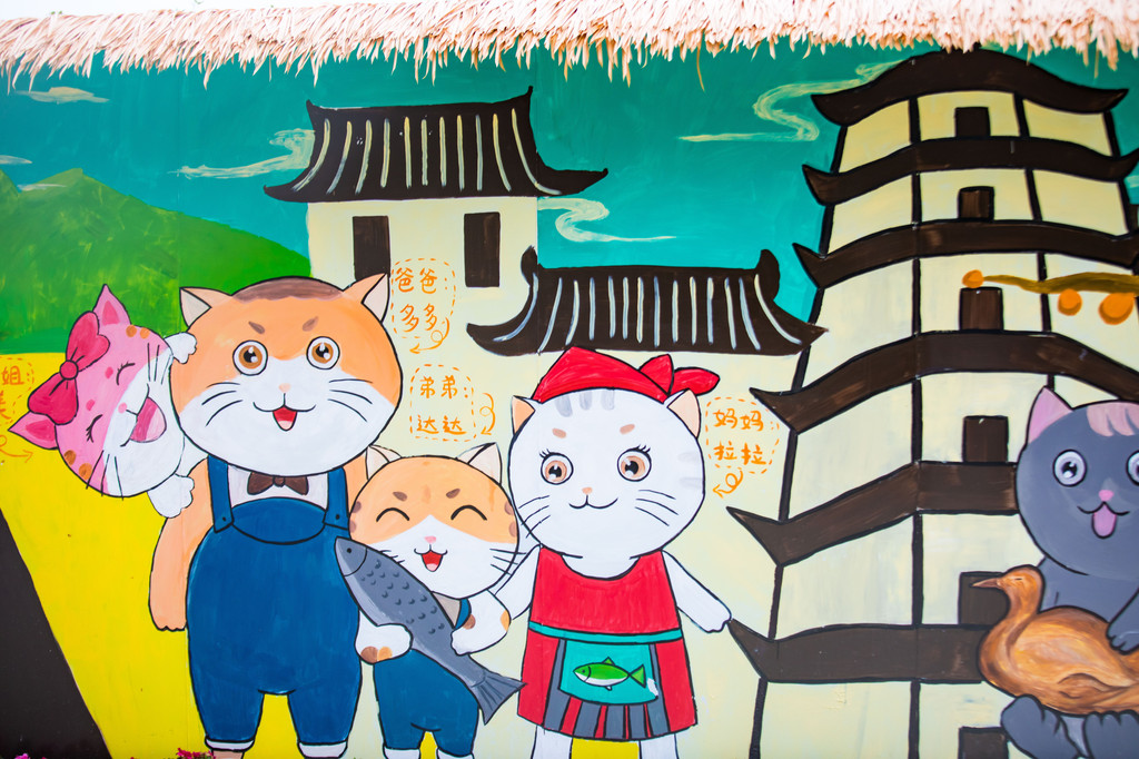 猫爪谷是需要收费的,门票是98元,买票进去后,从左手边开始游览,前方有一个一口之家正在欢迎着我们,这是四只猫咪做成的雕塑。十分的可爱,他们墙壁上画满了关于猫咪的画像,还有的画成了蒙娜丽莎的样子。