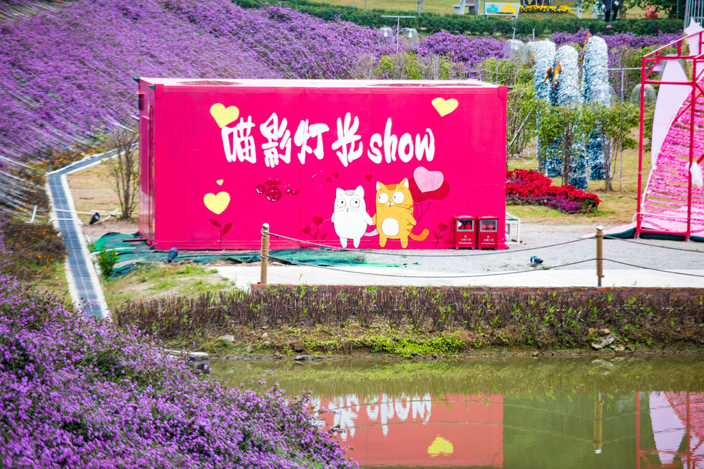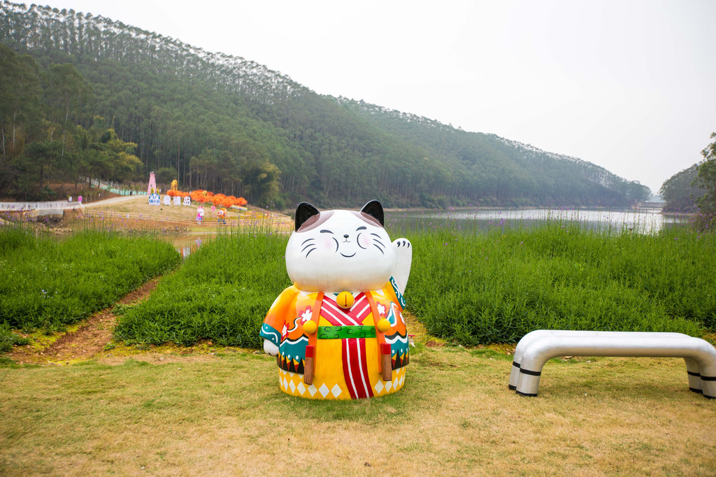 继续沿着步道向前走,这条步道是围绕着湖泊建造的,尽头有一个大大的充气猫咪,还有一条显眼风铃小路,风一吹过,丁灵灵的作响,旁边种满了薰衣草,远远的望过去,一片紫色,格外的好看。