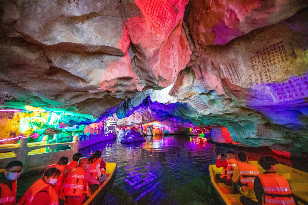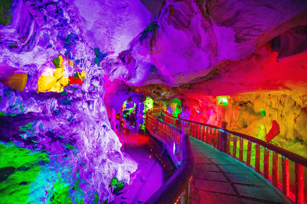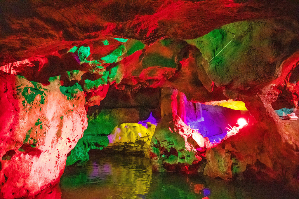乘船进入到石岩洞里面,在各种灯光的印衬下,溶洞里面如梦如幻,就像一个神话世界。