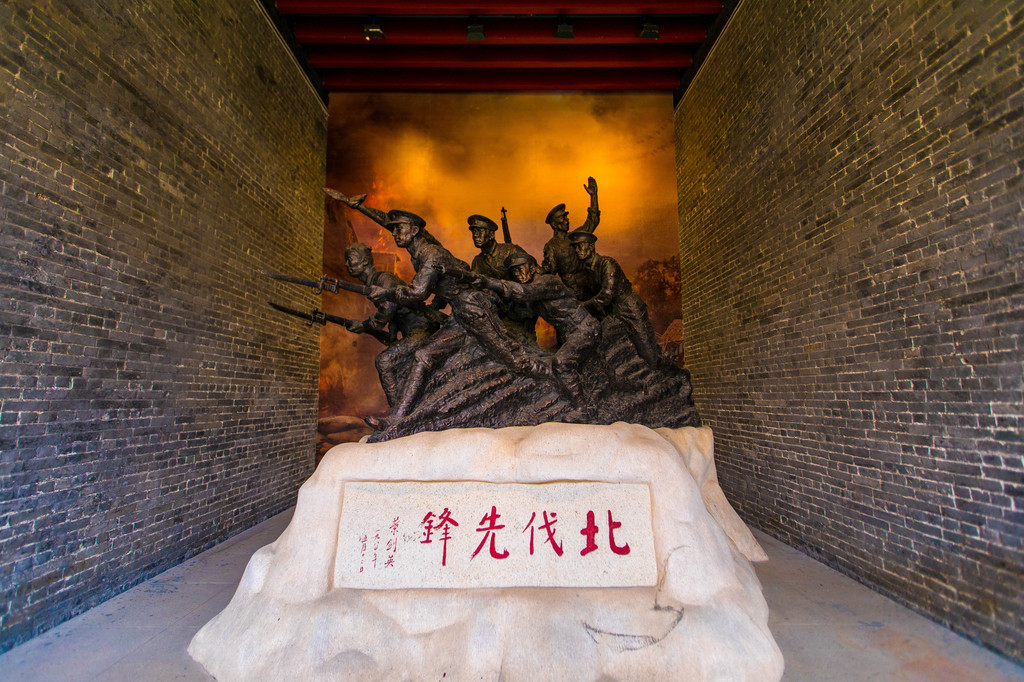 进入到屋子里,正中央有一块非常大的石雕,上面雕刻的是当年独立团战争时的样子,下面用红色大字写着弘扬铁军精神,传承红色基因几个大字,阅江楼是一处弘扬红色精神的地方,也是我们缅怀先烈的地方。