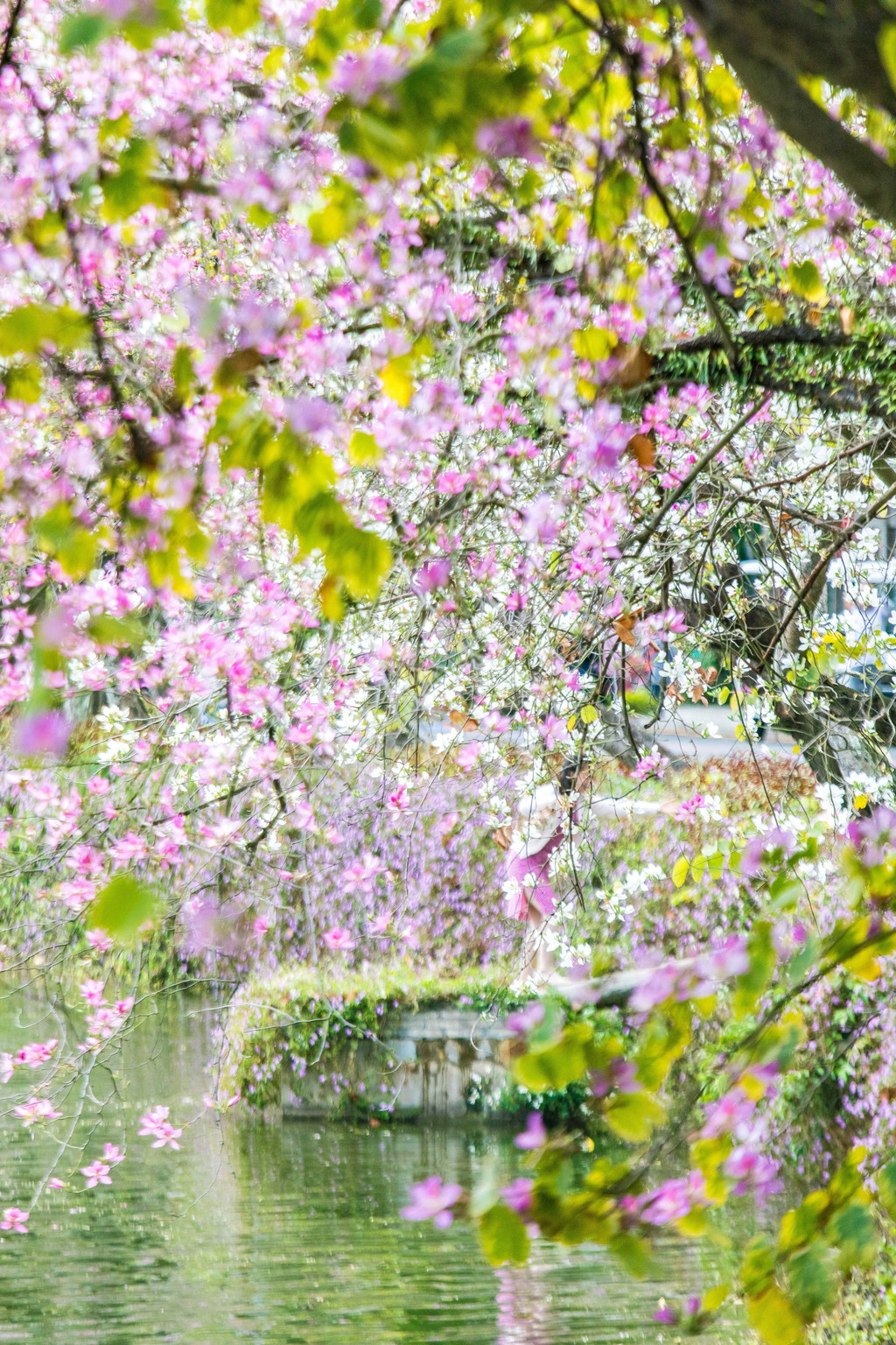 最后当然是来到了紫荆花步道,从车上下来之后,在南门附近,沿着河边行走,紫荆花就开在了湖边,很长一条路,这里的游客也是最多的地方,大家都在欣赏美丽的紫荆花。