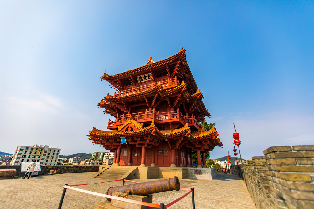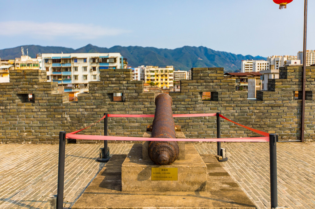 如今披云楼也复原了当时的瞭望台功能和塔炮,站在台子上是拍摄披云楼的绝佳位置,两侧的塔炮是清代的塔炮,已经被围绕了起来供人参观。