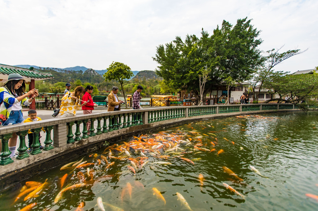 从溶洞来到了观鱼亭,这里位于天柱岩旁,浮在水面上的栈道两侧挤满了各种颜色的鲤鱼,看到有人过来,一条条鱼就长大了嘴巴等着鱼食,而它们也仿佛有了灵性,看到了人就看到了食物,这个场面也着实有点好笑。