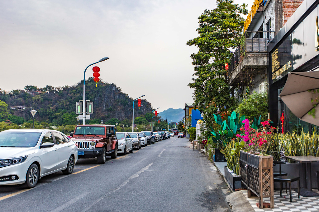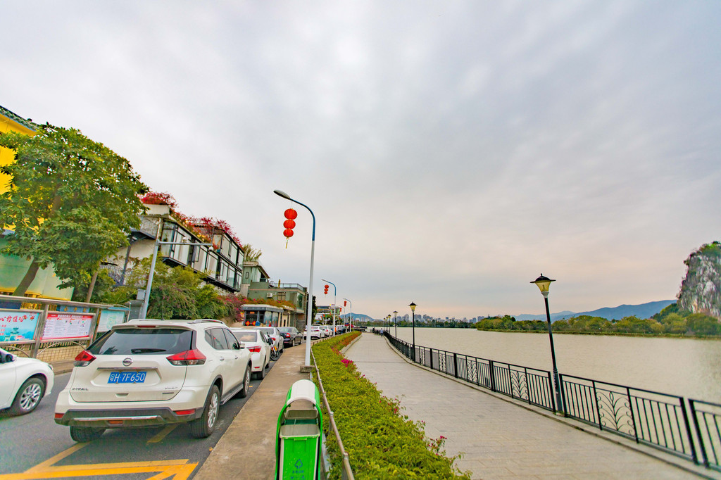 岩前村在七星岩东侧的青莲湖畔,从七星岩的东门出来,沿着星湖大道步行10分钟就来到了岩前村的村口,这里有一个大牌坊,上面写着岩前宝湖大道六个大字,从这里开始的1.4公里上开满了各种文艺的店铺。