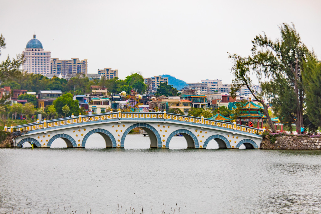 坐在观光车上,一路走来,远处的岩石,近处的湖面,还有连接两侧的桥梁,道路两侧开满的鲜花,刚下过雨的空气十分的清新,路上是来来往往的行人,经过玉屏岩,走过七星桥,来到了五龙亭。