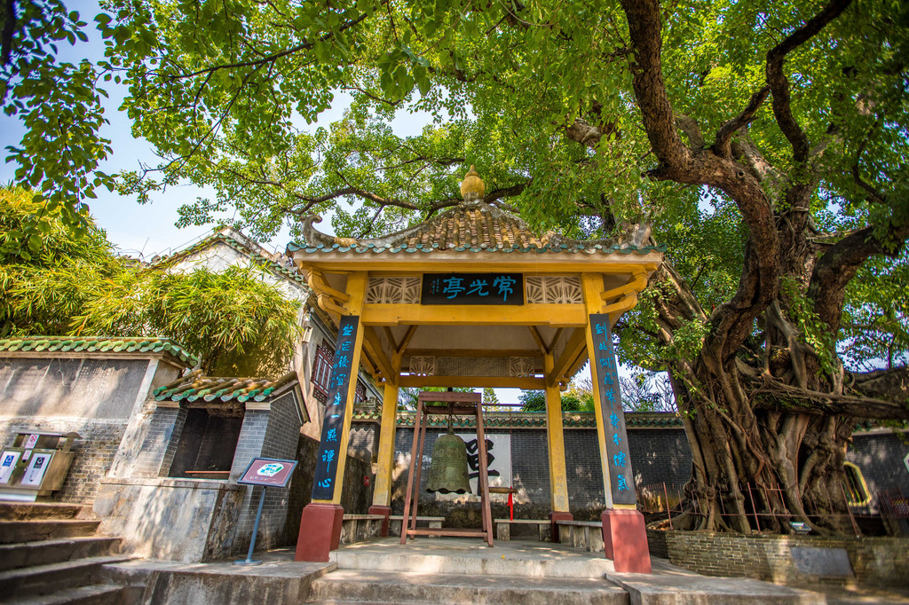 从入口进去后,爬一小段台阶,抬头看是一座常光亭,里面是个钟,游客是可以敲响的,亭子也是被一颗古树笼罩了起来,入眼是一片盎然的绿意,往左走便来到了梅庵的山门。