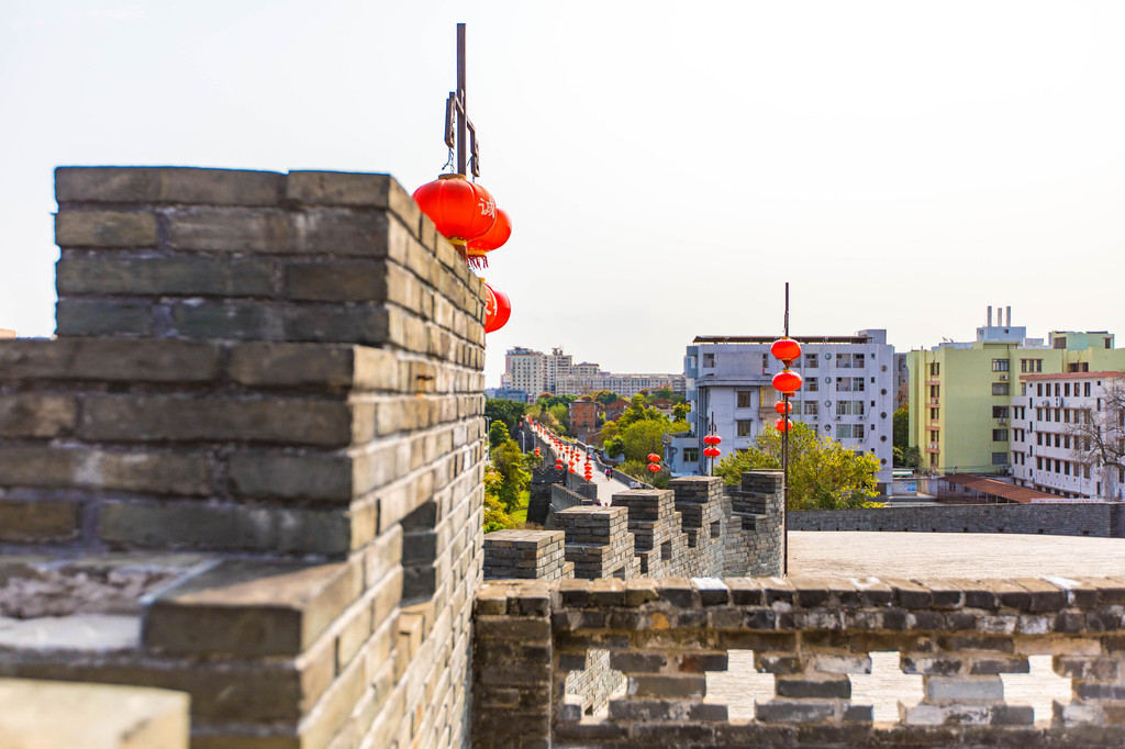 从阅江楼到达宋城墙还是很近的,大约十分钟左右。乘车到达西门朝天门下车后,城墙上还挂满了红灯笼,过年的氛围仍旧存在,城门两侧都有可以登上城墙的楼梯,一步步走上去,看到两侧的青砖。
