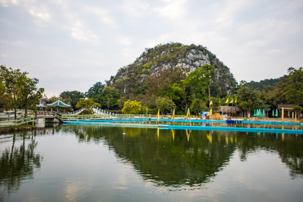从五龙亭乘坐观光车两分钟便可来到了水月宫,这是一组红墙黄瓦的建筑物,从水月宫出来,旁边就是步步高景观,站在湖边,可以看到仙掌岩、蟾蜍岩、天柱岩三座岩石排排排列。一个比一个高,就像步步高般排列,站在这里更能感受到小桂林的样子。
