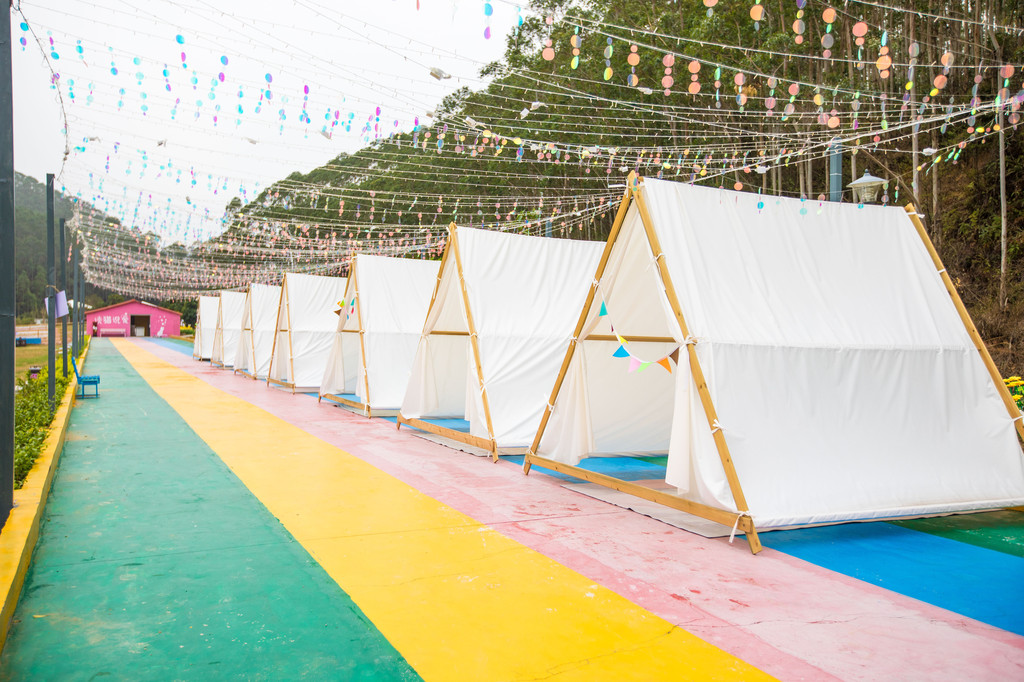 如果步行沿着整个猫爪谷行走还是有点累的,不妨在这里住一晚,除了集装箱可以选择,就在广场的另一侧还有很多小木屋可以选择居住,木屋前还有一片沙滩,还有可以在湖面上行走的小鸭子船,以及彩虹步道。