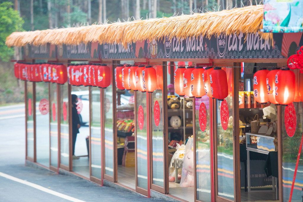 沿着小路走两分钟便来到了商店,里面有很多关于猫咪元素的商品,每一个都十分的可爱。商店前面是一个小小的广场,如今还摆放着过年的一些元素,听说后期是要摆一个巨大的猫咪雕塑,想一想还是有点期待呢。