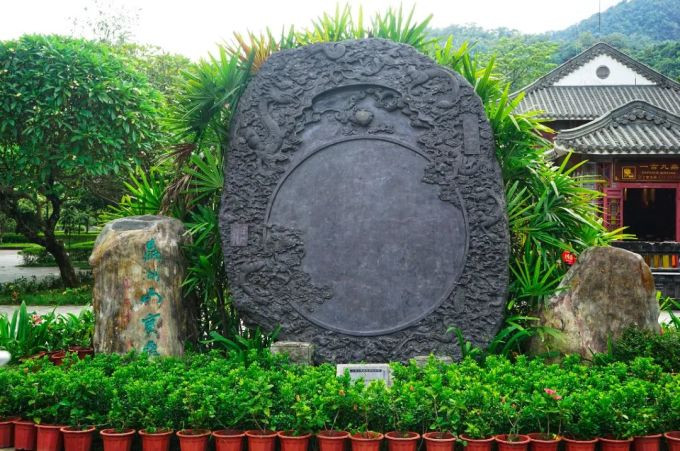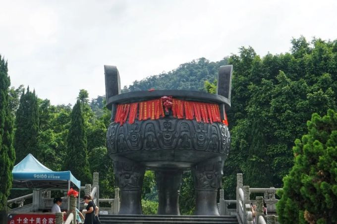 鼎湖山名字的由来也是相当有意思。听导游小姐姐的介绍,一开始鼎湖山用的是山顶的顶,因为在山顶有一个天然形成的湖泊,一年四季都不会干涸,所以顾名思义“顶湖山”。这段典故也有着历史记载:广东通志称“顶湖”,旧志记载“上有湖,四时不竭”,庆云寺记“绝顶有湖”,因名为“顶湖山”。到了2000年,九龙宝鼎从江西南昌运抵鼎湖山的宝鼎园,鼎湖山才名副其实地有了“鼎”。九龙宝鼎,鼎口直径5.58 米,鼎口周长17.5 米,鼎腹直径5.55 米,鼎腹周长17.42 米,鼎高6.68 米,重16吨,被誉为“天下第一大鼎”。在九龙宝鼎前面的端溪龙皇砚,也是一个世界之最哦!整个端砚重达两吨,用一整块砚石雕刻而成。砚石上一共有108条栩栩如生的云龙和水龙,138个大小不一的石眼。蝴蝶谷是鼎湖山唯一对外开放的原始森林,里面的沟谷雨林生态环境及气候条件,十分适合蝴蝶生长。坐在蝴蝶谷古风的茶亭里,看着湖水碧波荡漾,也是一个非常惬意的时刻呢。