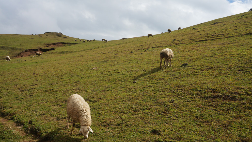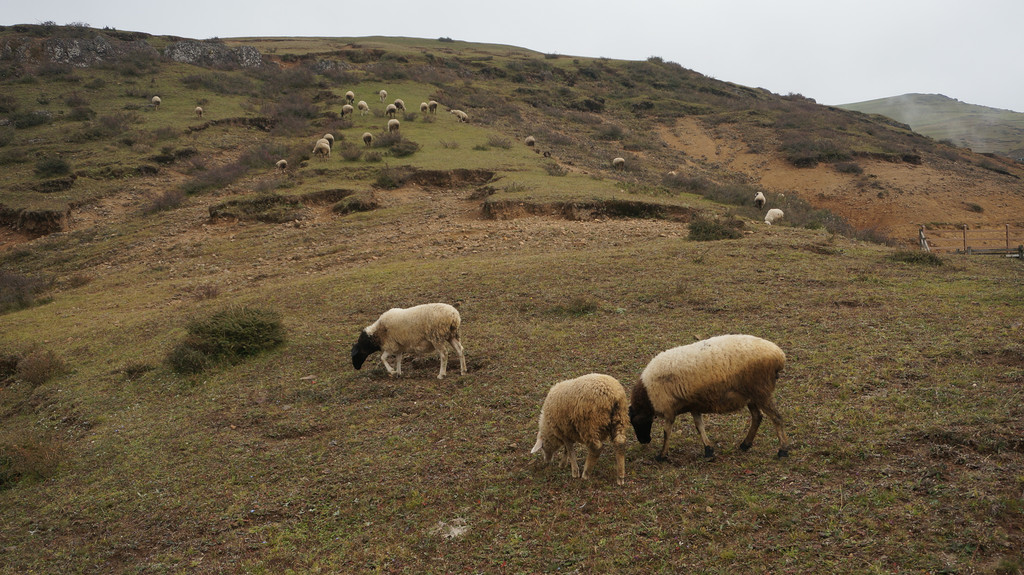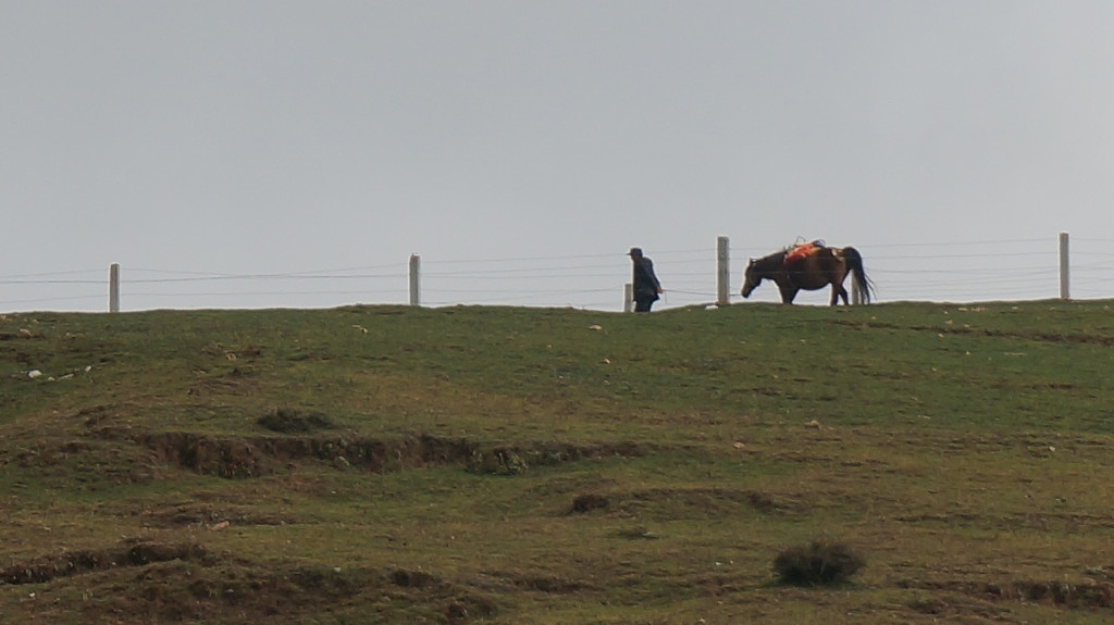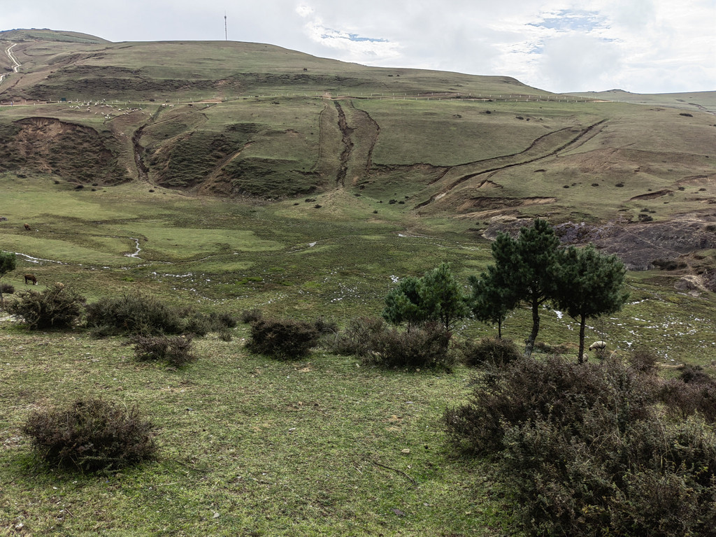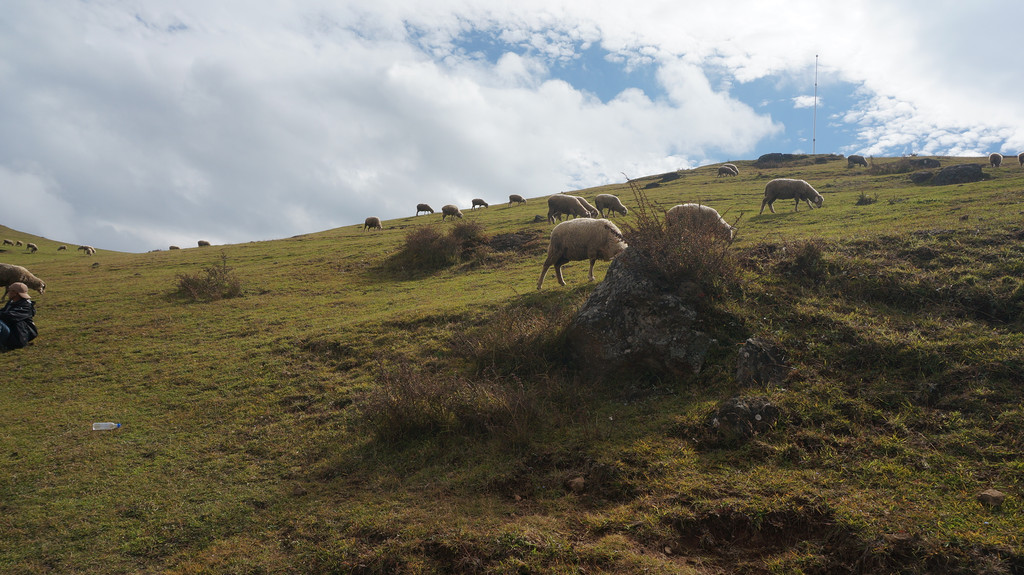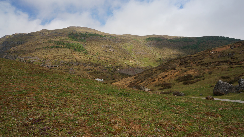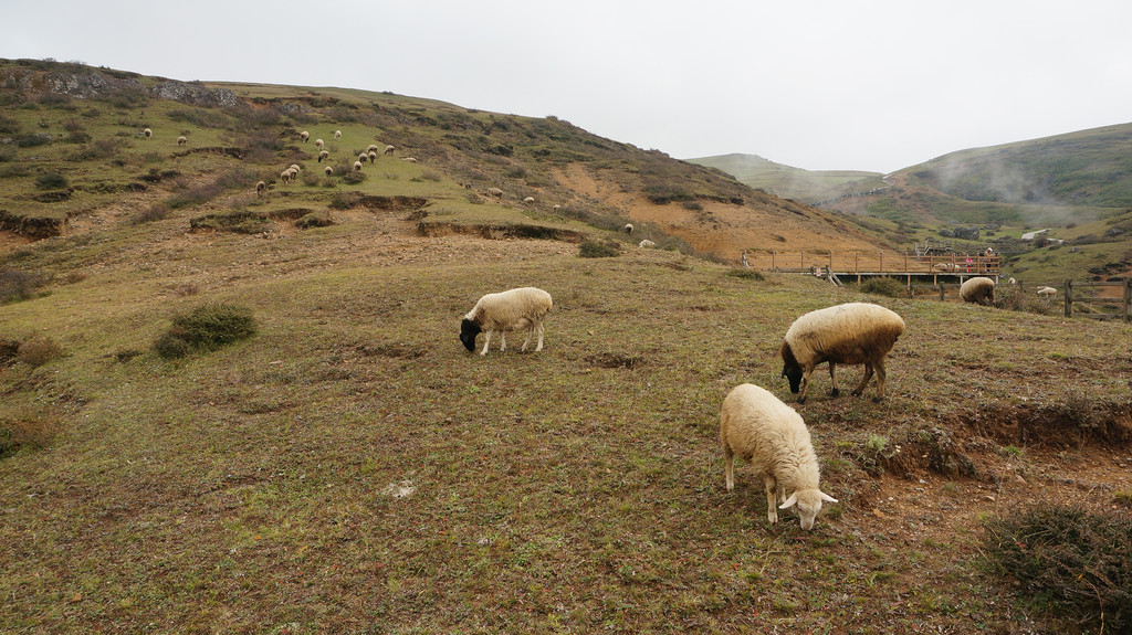 早饭后驾车从昭通出发,设置导航目的地为大山包景区,按指引走G356(一级公路,收费15元)行驶40余公里,后左转驶入一条盘山公路(昭大线)上山,23公里的盘山公路弯比较多,但路况良好,全程都是柏油路面。奇怪的是目的地并非景区入口,也不是景区游客中心或售票处,而是大山包换乘中心。而且景区不收门票,只收交通车费,无论是自驾还是自由行都必须在此换乘交通车方可进入景区,车费每人50元(据说旺季75元),老人儿童无一幸免。按当地村民的说法,该景区经营者尚未获得国家正式批准,故不能卖门票。换乘中心对面有一个很大的停车场,刚刚停好车,就有人前来兜生意,说只要25元即可带你进入景区。原本不想冒这个险,但不巧的是一班交通车刚刚开走,下一班还不知道要等多长时间,只好让村民带路进景区。由于我们车上东西多,没有空位,村民开摩托带路,收费也就翻了个倍。摩托车引领我们走一条土石小路,穿过一个小村庄和一大片高低起伏的草地,就上了景区内部道路,带路的人就让我们自己向前开。这时要注意的是看到一个停车场就到达目的地了,而我们却走过了头。后来感觉不对才掉头返回,白白多跑了十几公里。