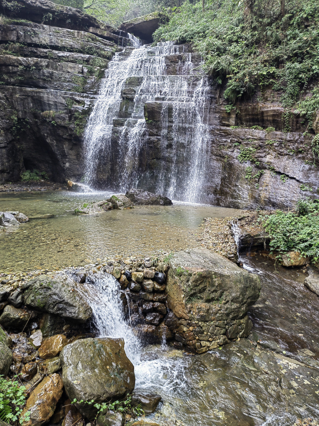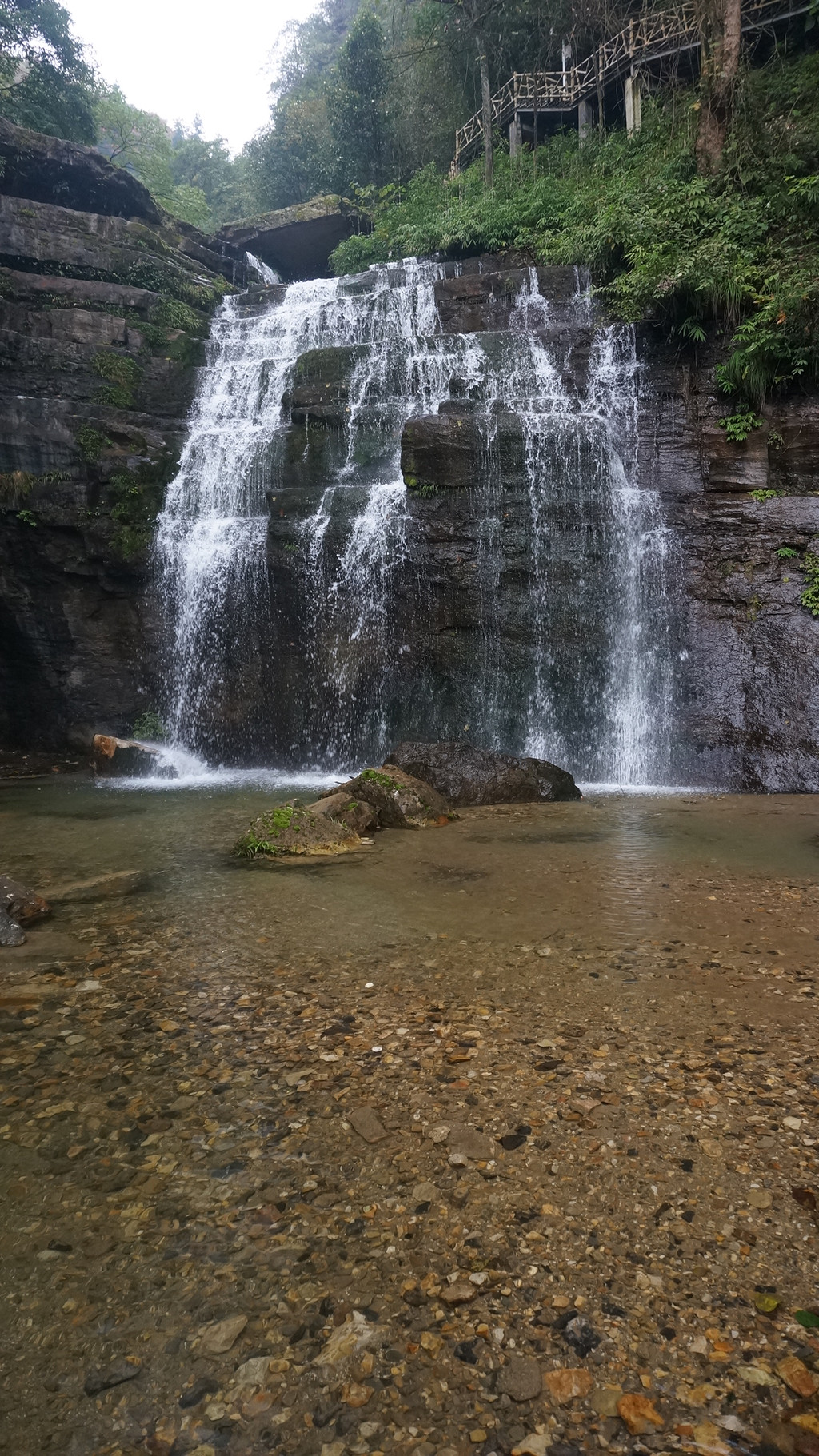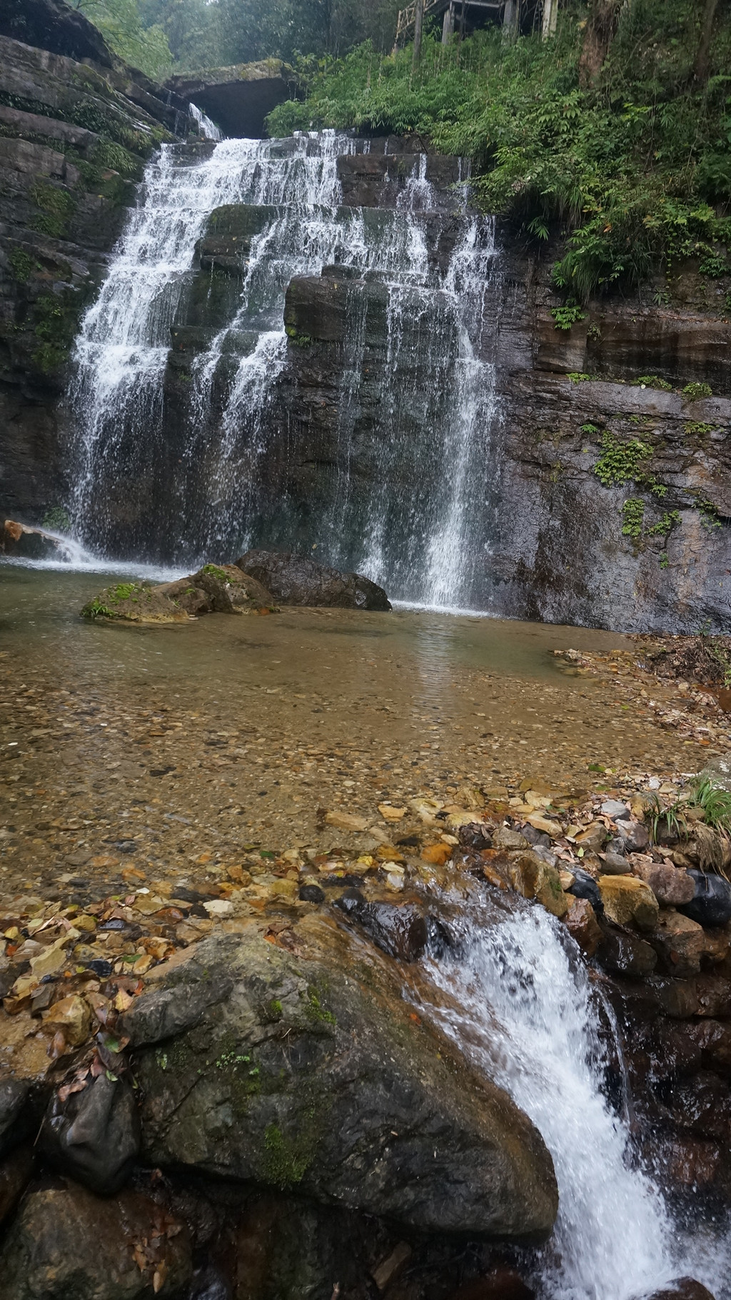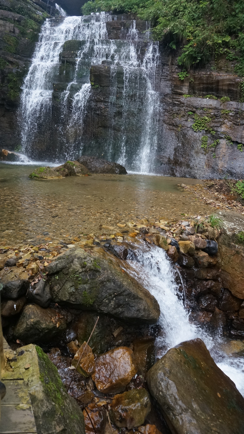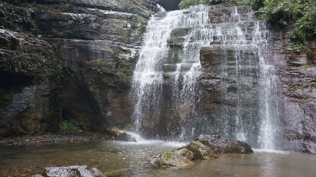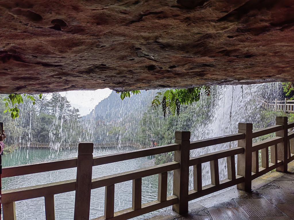 洞房瀑中间有块大石板,是拜天地的地方。傍边的洞是洞房,直泻而下的瀑布是天然的门帘。