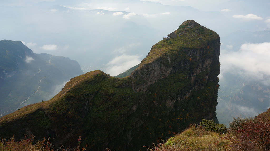 金沙江的支流牛栏江如一条玉带,曲折蜿蜒流经此地,将起伏舒缓、绵延不绝的大山包高原硬生生地切割出一个绝对高度达2600米的绝壁峡谷,比美国的科罗拉多大峡谷还深1000米。高原边缘、峡谷之畔,一座孤峰突兀矗立,三面凌空、壁立千仞,气势磅礴,阳刚之气十足。山顶上一字排开的巨石,酷似活灵活现的鸡冠,鸡公山由此得名,大峡谷也因山得名鸡公山大峡谷。云南著名作家于坚到了大山包的鸡公山后无限感慨地说,鸡公山的大峡谷,绝不亚于美国的科罗拉多大峡谷。他给这个大峡谷取名“雄狮大峡谷”。