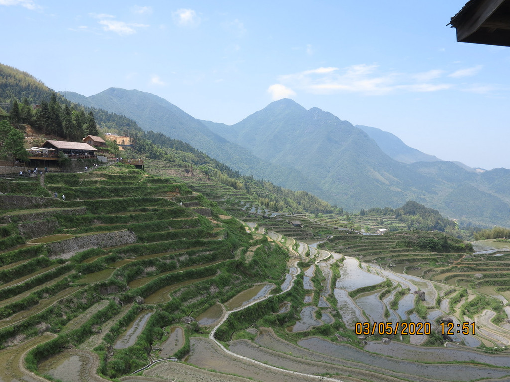 五月三号,天气很好,酷热。驱车去云和梯田看风景。云和梯田属于这里出名景点,山里的山路已经建造的非常好了,山上也在造缆车,这里主打休闲、摄影、观光、很多的农家乐。整个梯田景区包含七星墩、日出云海和白银谷三大景区。我们第一站驱车去最远七星墩,这里可以俯瞰梯田,主路上拐弯走了几公里破路,这里停车场不大,好在游客不多。