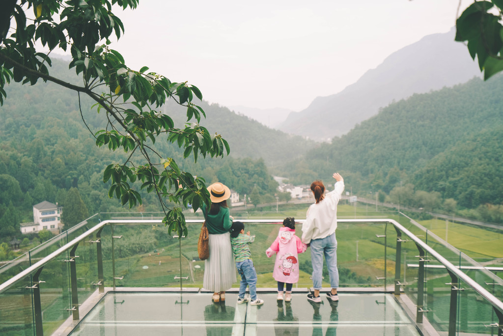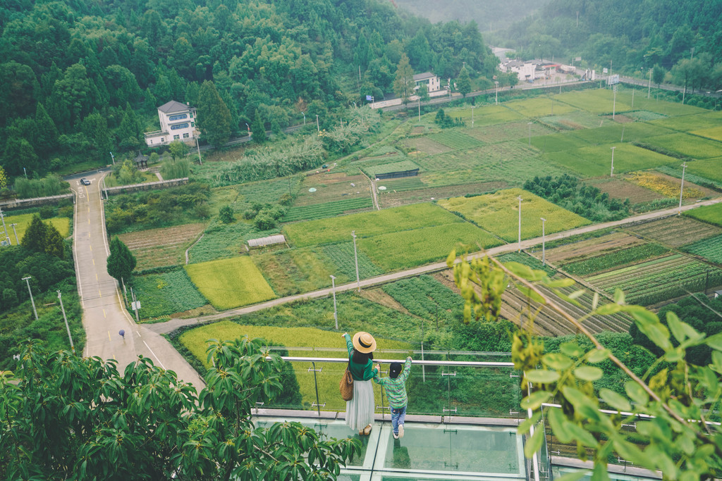 山顶有个玻璃观景台,高约百米、悬挑五米,踩在上面,有惊心动魄之感。站在玻璃观景台往远处眺望,山峰连绵,脚下的稻田黄绿相间,相信不久之后,就要迎来一片金黄的丰收季吧。