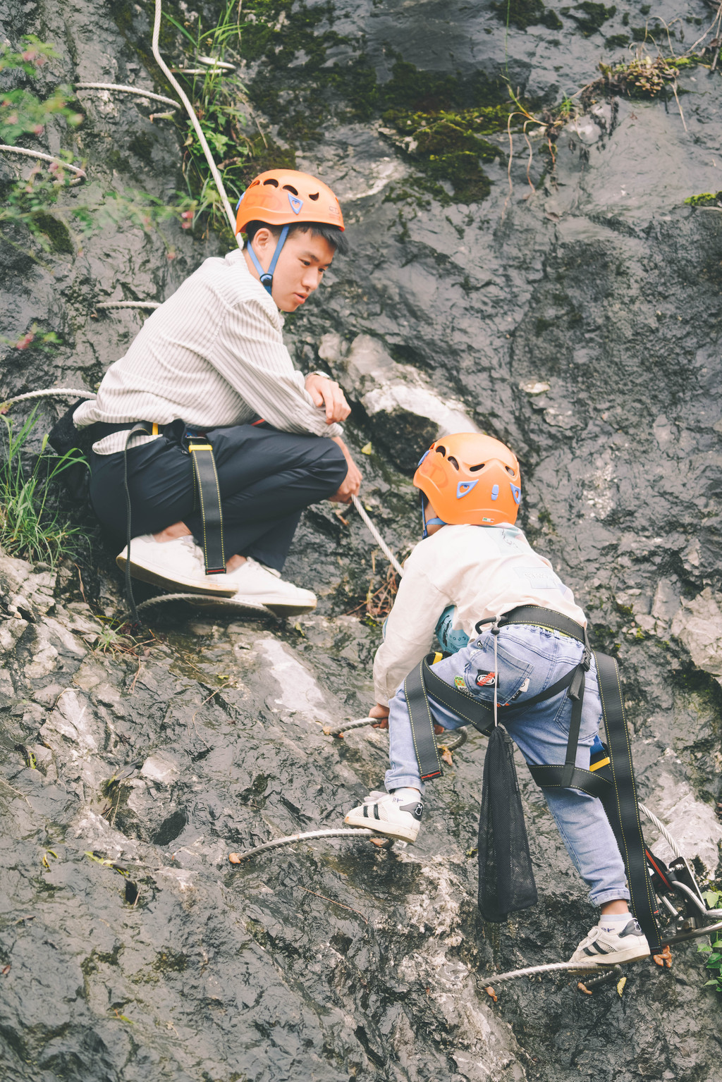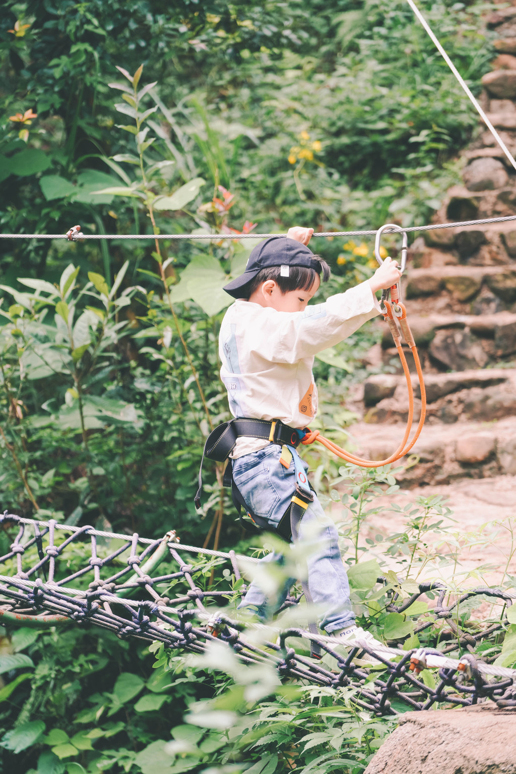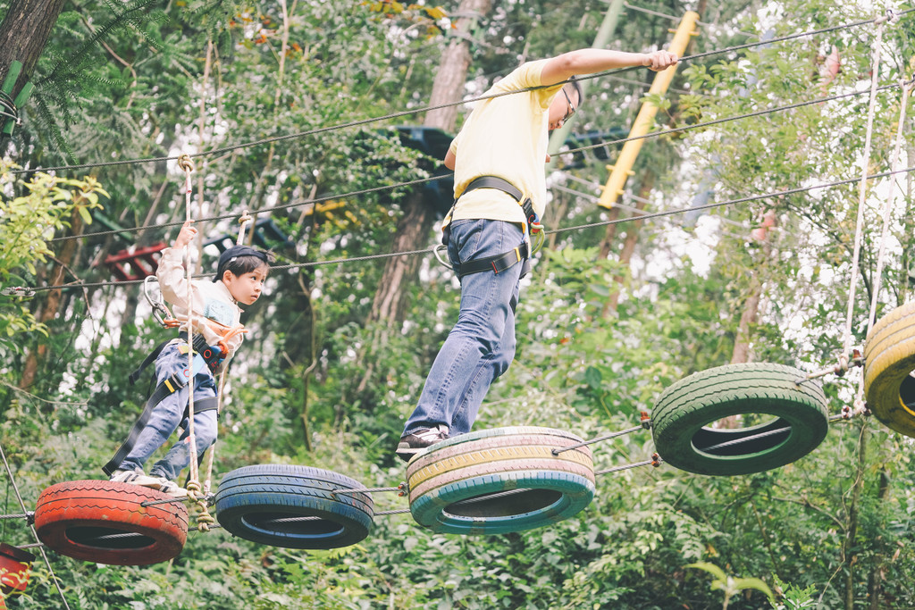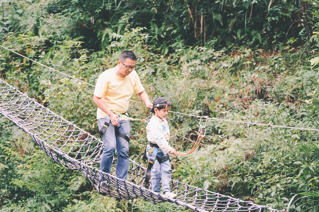 元宝尤爱空中漫步,穿上装备,和爸爸一道,小心谨慎,亦步亦趋,一下子穿越吊桥,一下子宛如在丛林漫步。