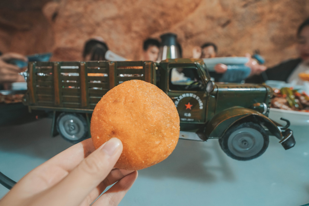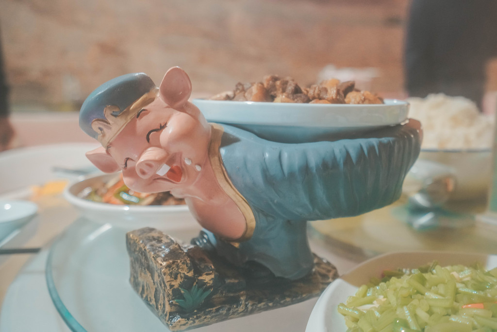 溶洞餐厅的菜品以当地特色菜为主,装菜的容器很是特别,解放牌的军车造型复古,猪八戒背媳妇的菜盘让人忍俊不禁。
