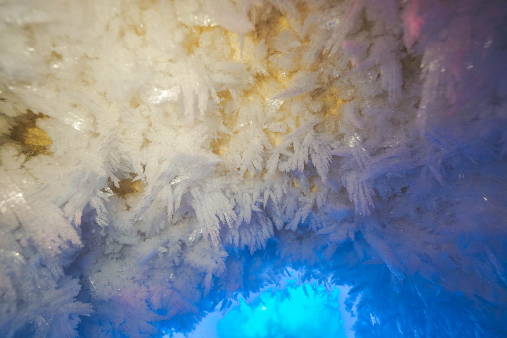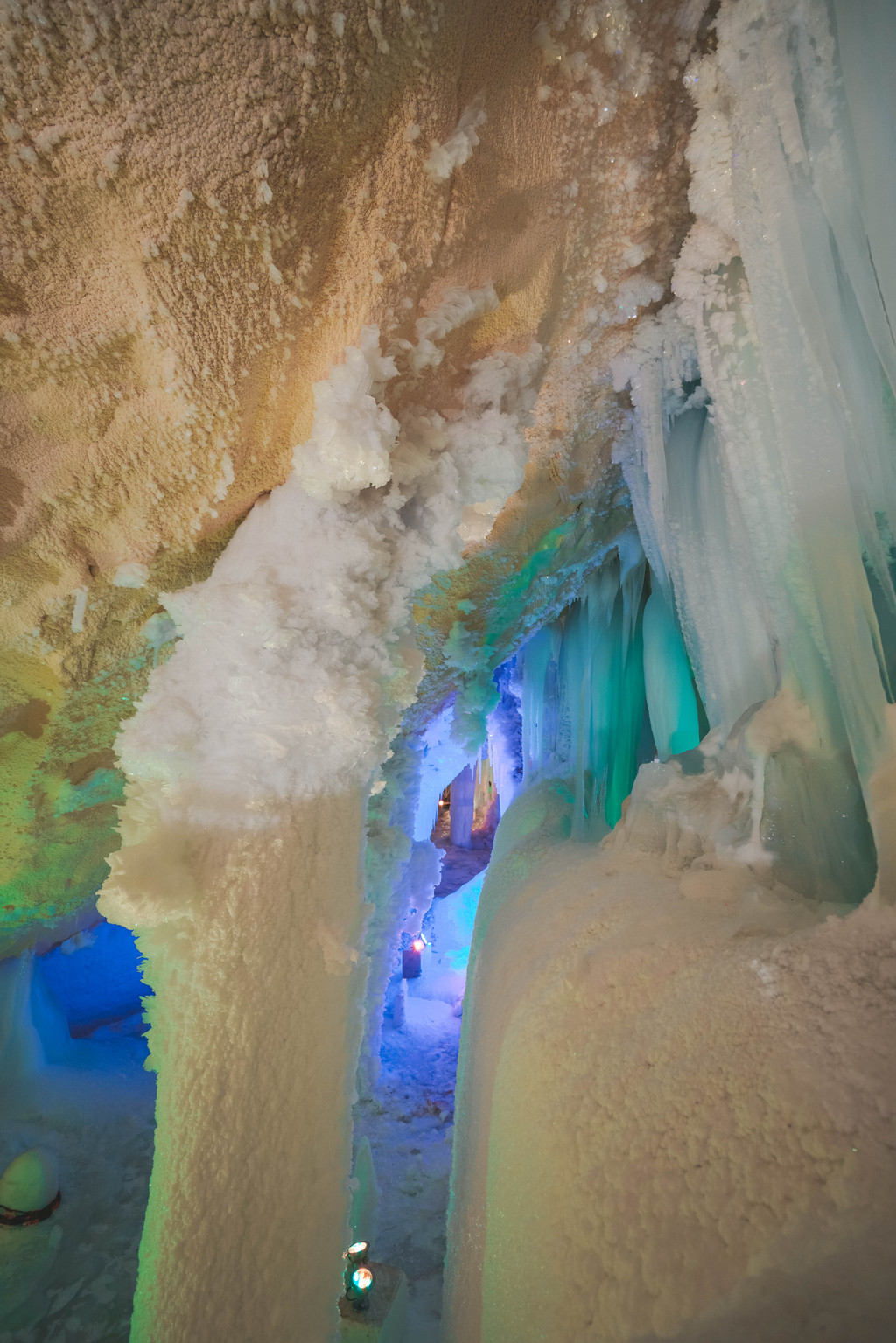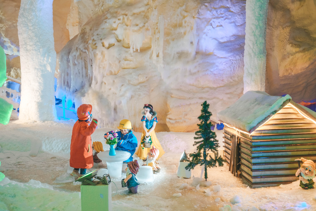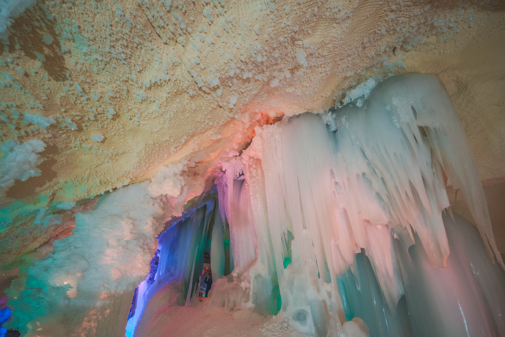 包括冰瀑布、冰崖、冰柱、冰花、冰幔等等等等,在灯光的效果之下色彩绚丽,如梦似幻,宛如现实版《冰雪奇缘》的情景再现。