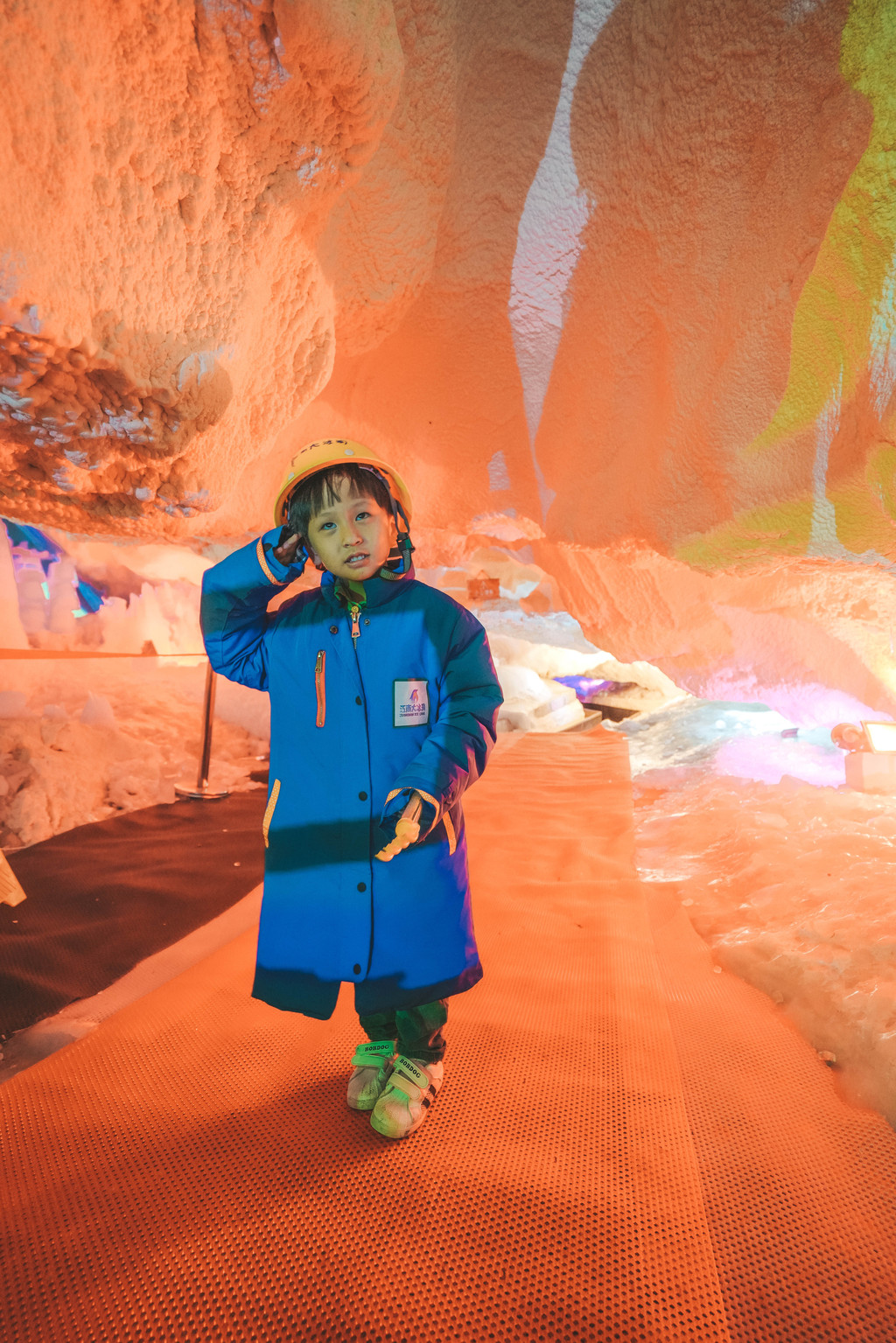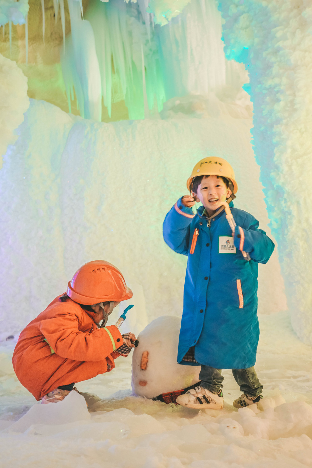 元宝和涵涵穿上景区租赁的大棉服,说好像走近了大冰箱里,一点都不怕冷,兴奋的在大冰洞里进行一场冰雪探险。