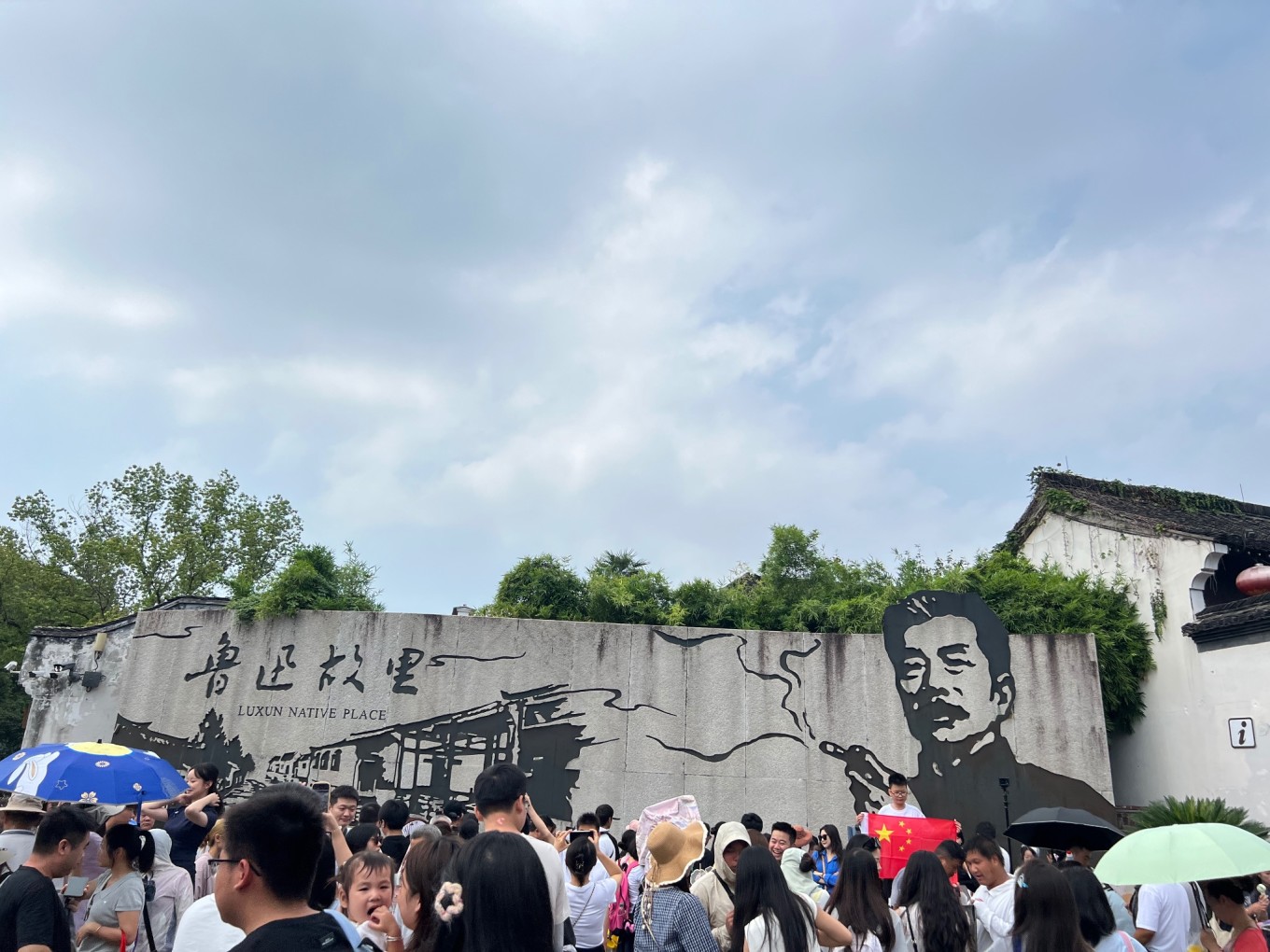 在酒店吃完早饭,8点15出发,到鲁迅故里差不多8点半,我们提前停车了,因为门口这条路很堵,不如步行快。8点半左右到达的鲁迅故居,在门口的网红墙拍照打卡,孩子们非常不情愿,。我们来的时候还算早,当时人不多,进祖居不用排队,直接进就行。
