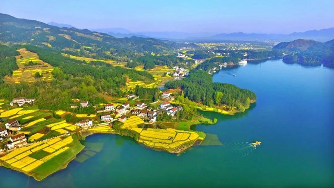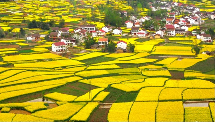 陈村自然环境优美,近千亩高产油菜的浩瀚花海有如大地涌起金浪,不远的陈村水库也与油菜花交相辉映,犹如童话世界。