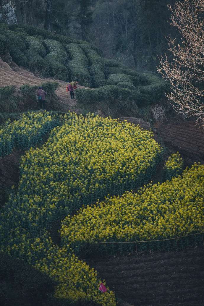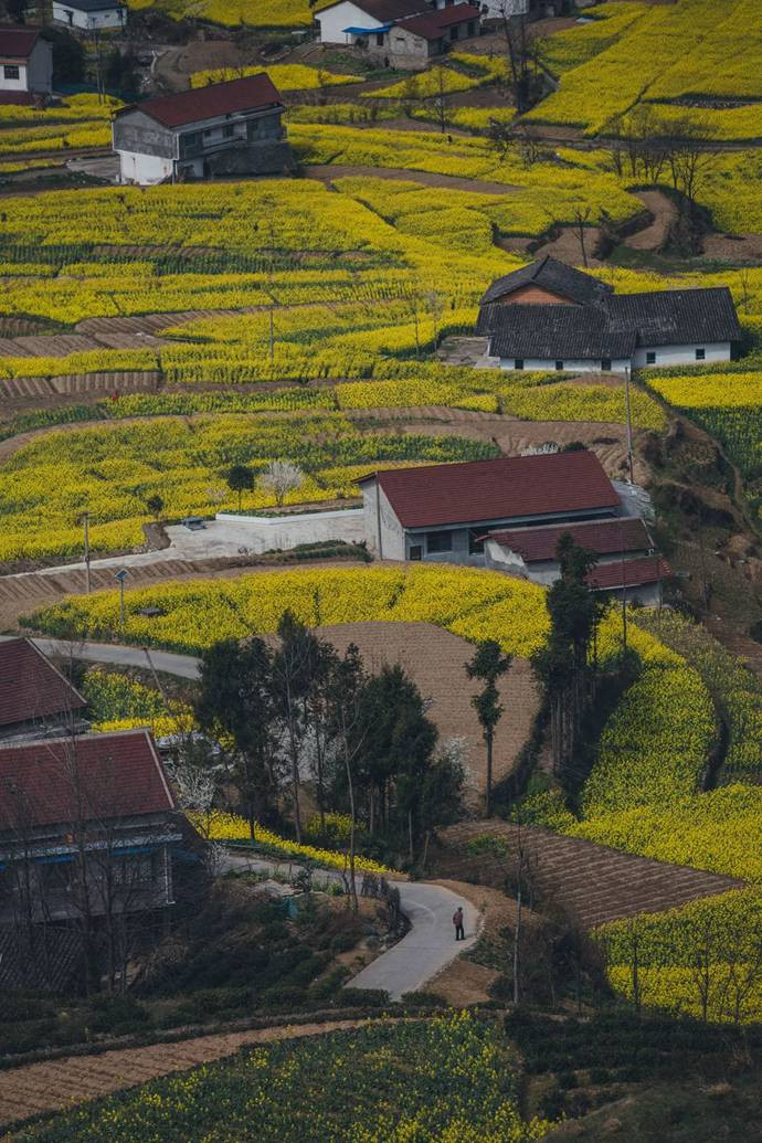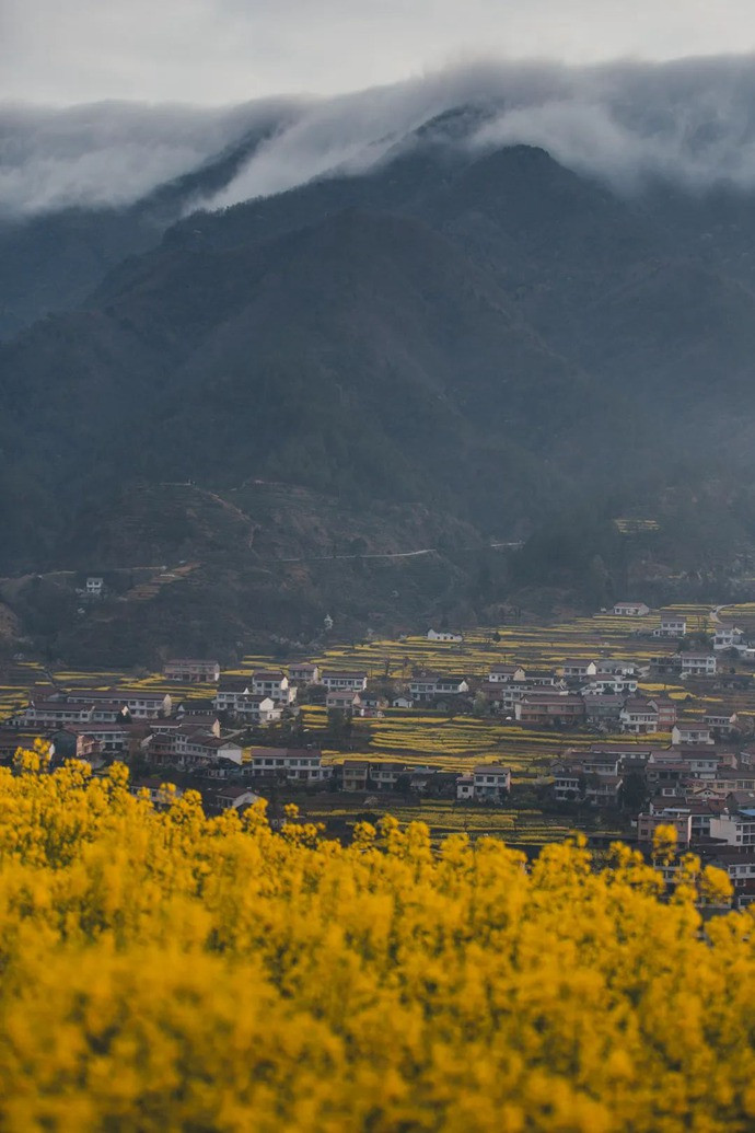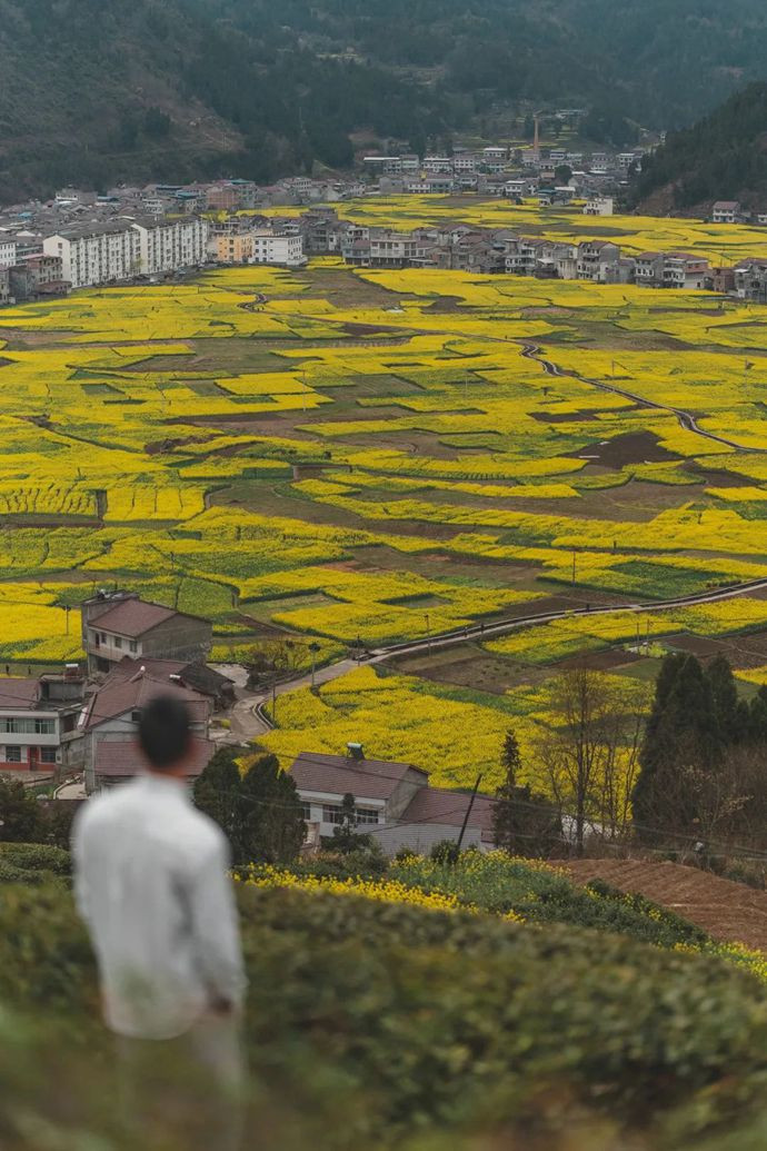 不同于平原的油菜花,渔渡镇九家榜村的油菜花多种于山腰梯田处,梯田与村舍相依,云雾与炊烟交融,线条与色块呼应,这是在汉中平原见不到的梯田油菜花春日画卷。