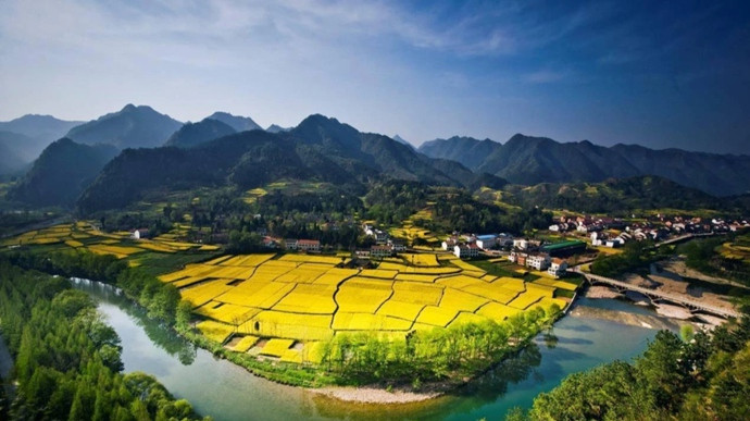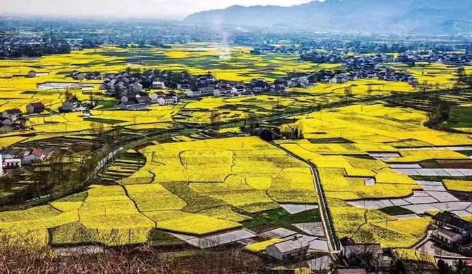 盛开油菜花与镶嵌其间青山绿水相互掩映