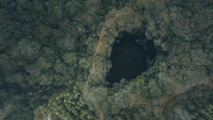 圈子崖天坑,从空中鸟瞰坑口形状犹如一个大脚掌,是迄今为止全球海拔最高的天坑。