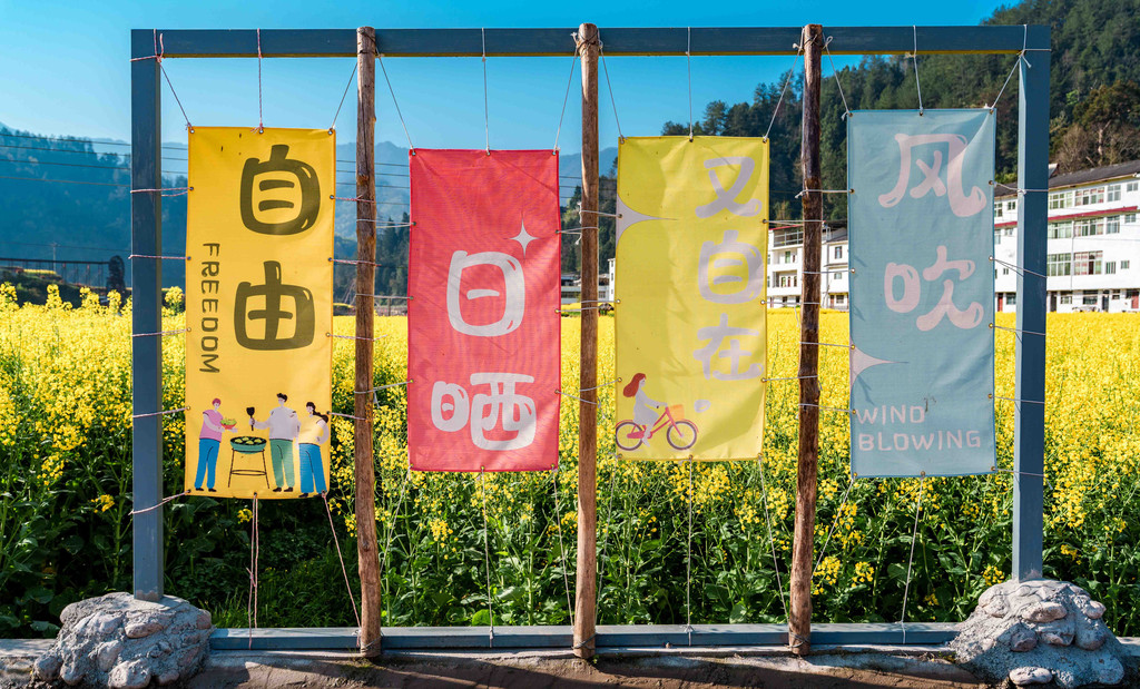 这里的油菜花海虽然不如其他镇子面积大,但却是一年四季都可以打卡的好去处,因为村子里打造了许多的网红元素,像拍照好看的帐篷、文创字幅、水车等应有尽有,甚至还有“我在李塘很想你、暴富自由、恭喜发财”等文艺打卡点位和营地烧烤,很适合大家周末悠闲小游~