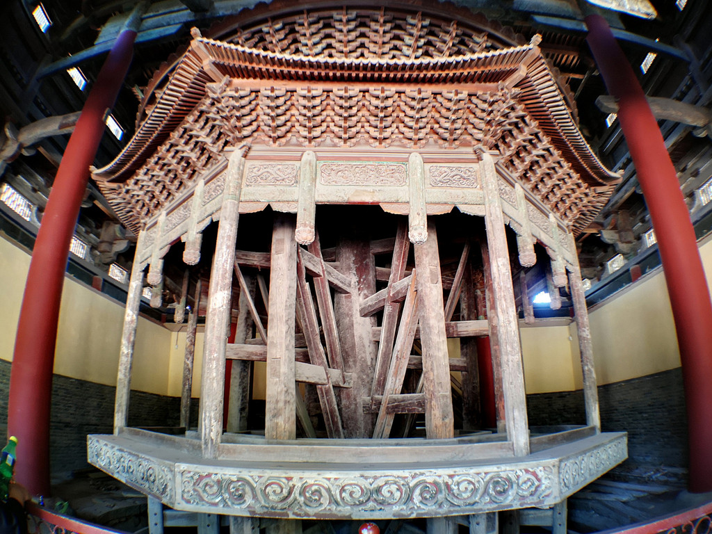 另外阁内还藏有我国早期最大的转轮藏,直径长7米,看起来像一座八角亭。据说它的重量仅有底部藏针承受,仅需轻轻一推便可转动。时常看见虔诚信徒在转轮藏前矗立,仿佛沉溺在千年历史长河中,期待这座庞然大物再次转起。
