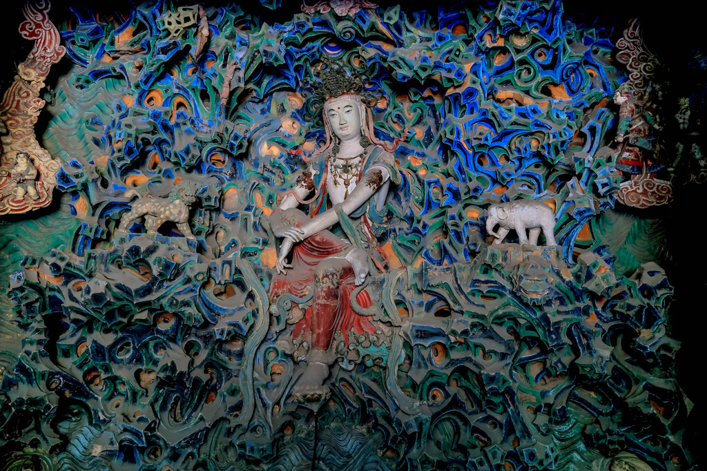 游览寺院时,最先看到的摩尼殿内五彩观音为其一。在一大片泥塑五彩悬山中间,倚着这位东方美神,她头戴宝冠,披肩下垂,凤眼微睁,面带笑容地俯视众生。而她周围的彩色悬雕上,凡人、仙人、罗汉、鸟兽等遍布其间,俨然一个极乐世界。鲁迅盛赞她为“倒坐观音”,说别的佛像把人神化,而这尊观音是把神人化了。