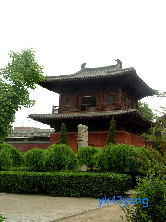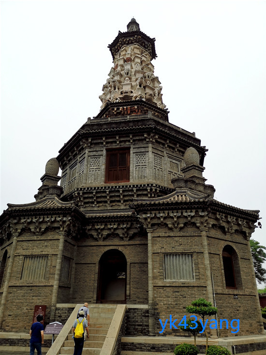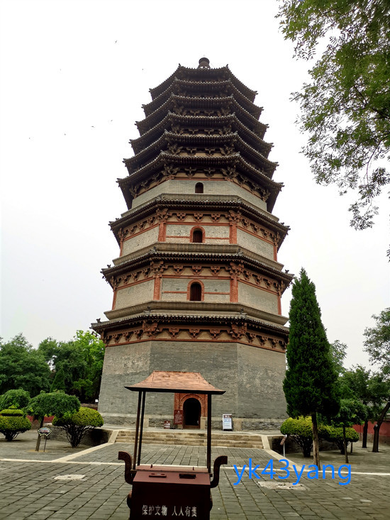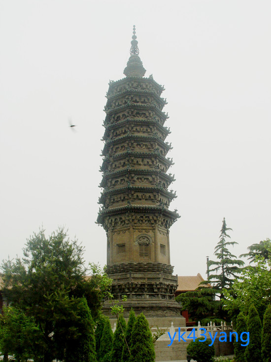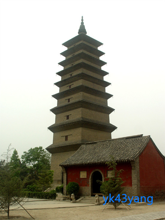 耸立在八角台基之上的凌霄塔是一座九层楼阁式塔,平面呈八角形,通高41米。此塔始建于唐咸通年间(860-874年),后来的塔身一到四层是宋代在唐塔残址上重建的,为全砖结构,五到九层是金代又重建的,为砖木结构。