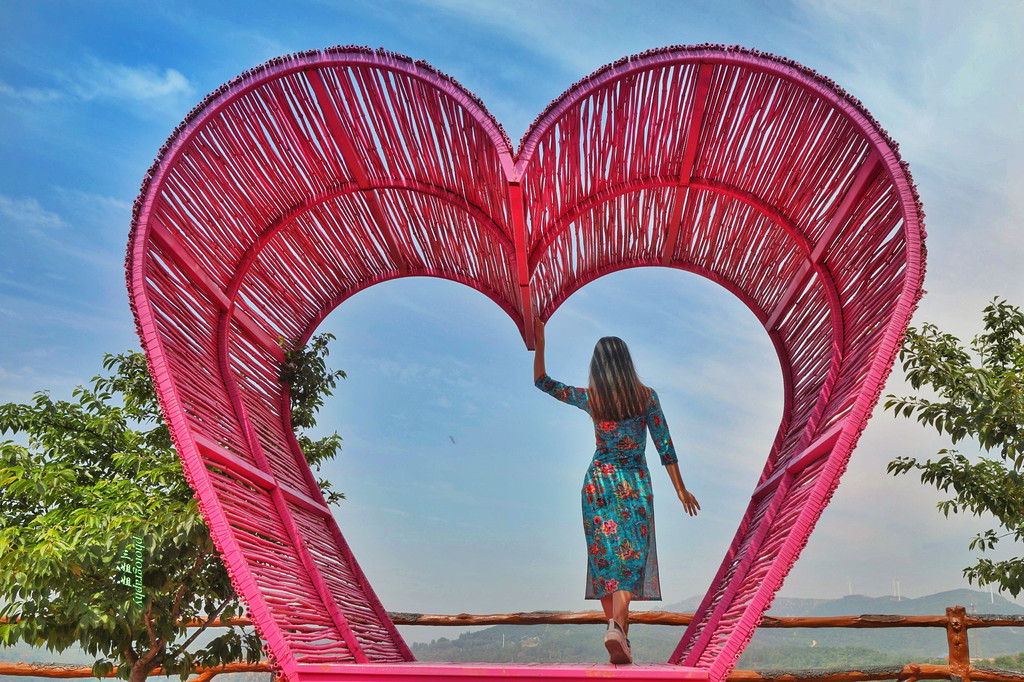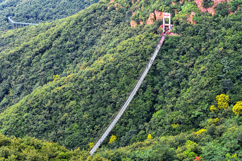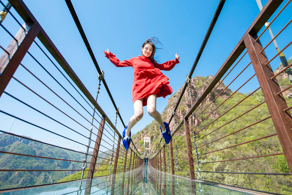 三泉湖有一座叫“凤凰天桥”的玻璃吊桥,这是中原首座悬索玻璃吊桥,近300米长,走在玻璃吊桥上,透视脚下如临深渊,恐高的我,一步一挪,如履薄冰,真佩服同行的小伙伴竟敢任性地飞身跳跃。