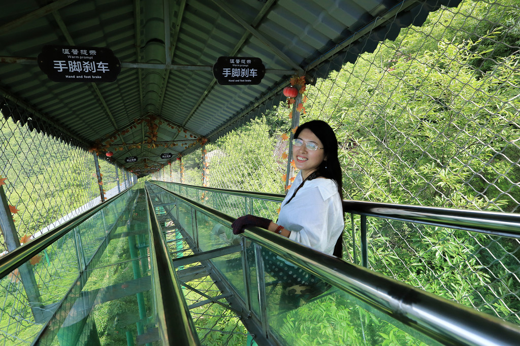 三泉湖不仅有奇特的玻璃吊桥,280米长的双排玻璃滑道,同样让人心惊胆战,滑道落差高达108米,在小伙伴的鼓励下,我勇敢的戴上手套,系上滑垫,体验了一回速度与激情。