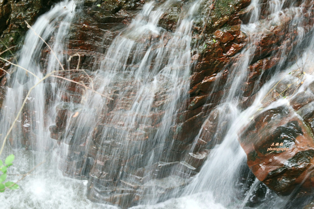 走在峡谷里,一路都有流水潺潺相伴,峡谷里大大小小的瀑布一个连着一个,数不胜数;那些溪流更是悠然自得地在红岩嶂谷之间舒展着身姿,跟着我的脚步叮咚向前。