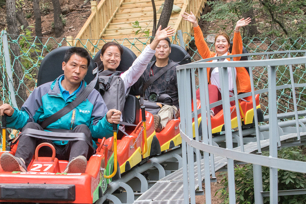 说起刺激,当属三泉湖穿越丛林的过山车,全程长度1988米,几个U型弯和360度大回旋,让人一路尖叫。丛林穿越也叫云霄飞车,可以连成一个小火车似的,我们的小伙伴们笑着、喊着,感受着呼啸而过的山风,那一刻,一切烦恼都随风而去了。