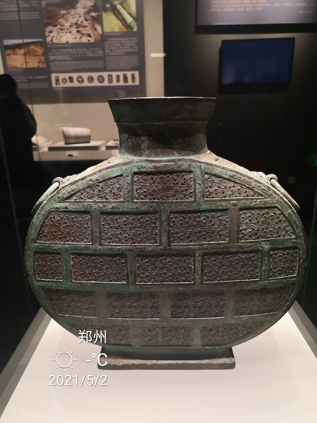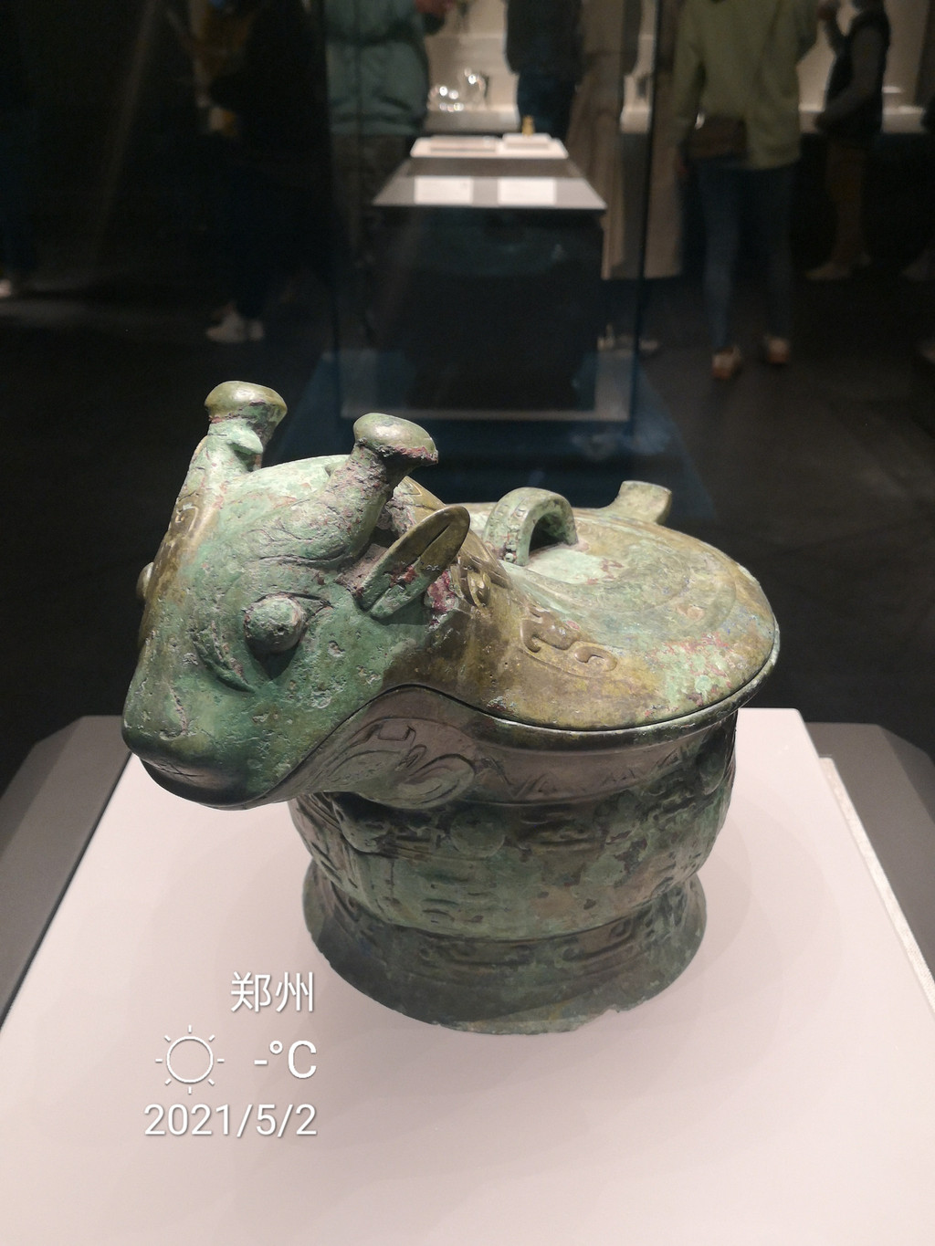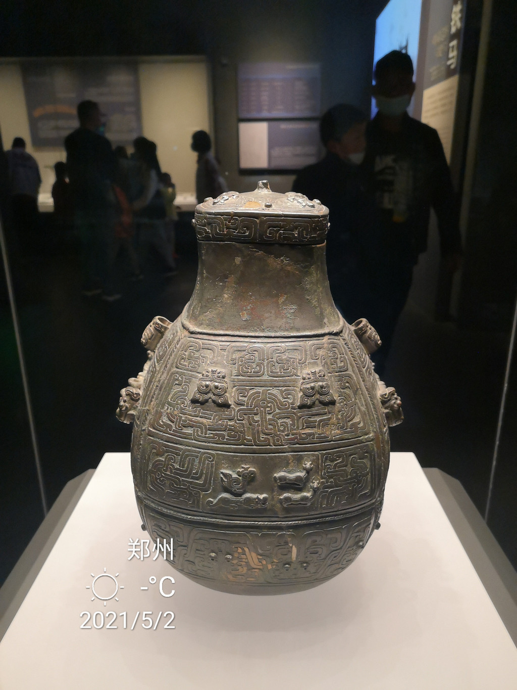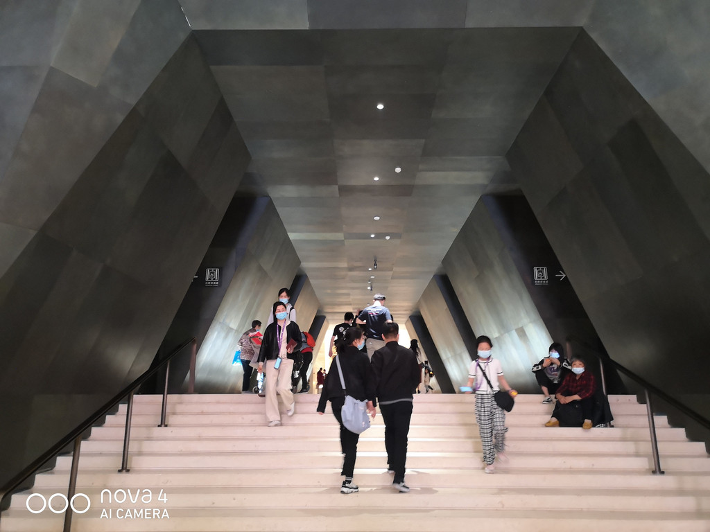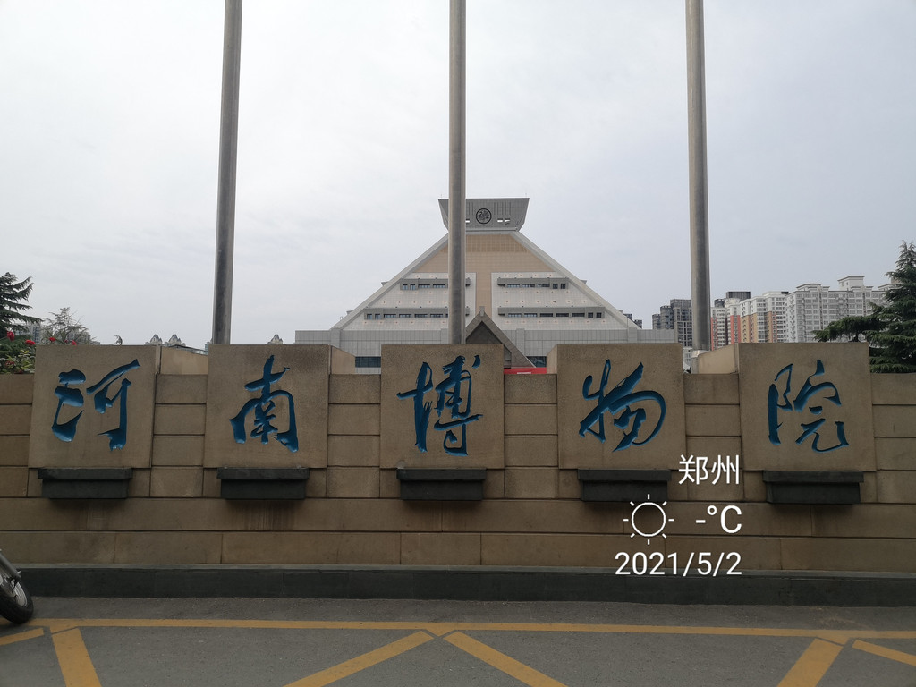 我们5月2日早晨8点左右出发,当天高速路上还不算拥堵,10点半左右赶到郑州,下高速,女儿给外甥女打电话,说我们已下高速,准备先去省博,问哪里停车方便,是否先到酒店,然后再地铁过去。外甥女回答,可直接去省博,如果先到酒店再去省博,由于两地相距较远,太耽搁时间。因此我们直接去了省博。导航引导至博物院门前,我们看到博物院门前停了许多车辆,似乎里面停车位已满,我们准备另作他图,忽然看到博物院正对,我们右边一家酒店有停车场对外开放,显示停车两个小时10元,超过一个小时加一元,只是挂牌车位已满。不过门口只停了一辆车等候车位,经我们下车询问,门卫告诉,如果有车位就可放行。还算幸运,不大会,里面有车离去,我们得以入内停车。安顿好,将近中午12点,已到饭时,而且距下午2点进入参观还有一段时间,决定先吃午饭。博物院正对那条马路往前不远,有一家烩面馆,吃客很多,这是郑州的招牌餐食,肯定要品尝一番,点了小菜烩面。餐后,时间12点半左右,如果等到2点,时间太久,我们决定尝试一下,看能不能直接进去,女儿他们肯定没有问题,关键是我们两人不在此时间段。博物院大门口只量体温,不检票,博物院场馆门内要刷身份证验票,我们顺利刷卡进入,没有拦阻。由此可见,所谓的时间段限制,并非那么严格,我们提前一个多小时进入,不也尝试成功。