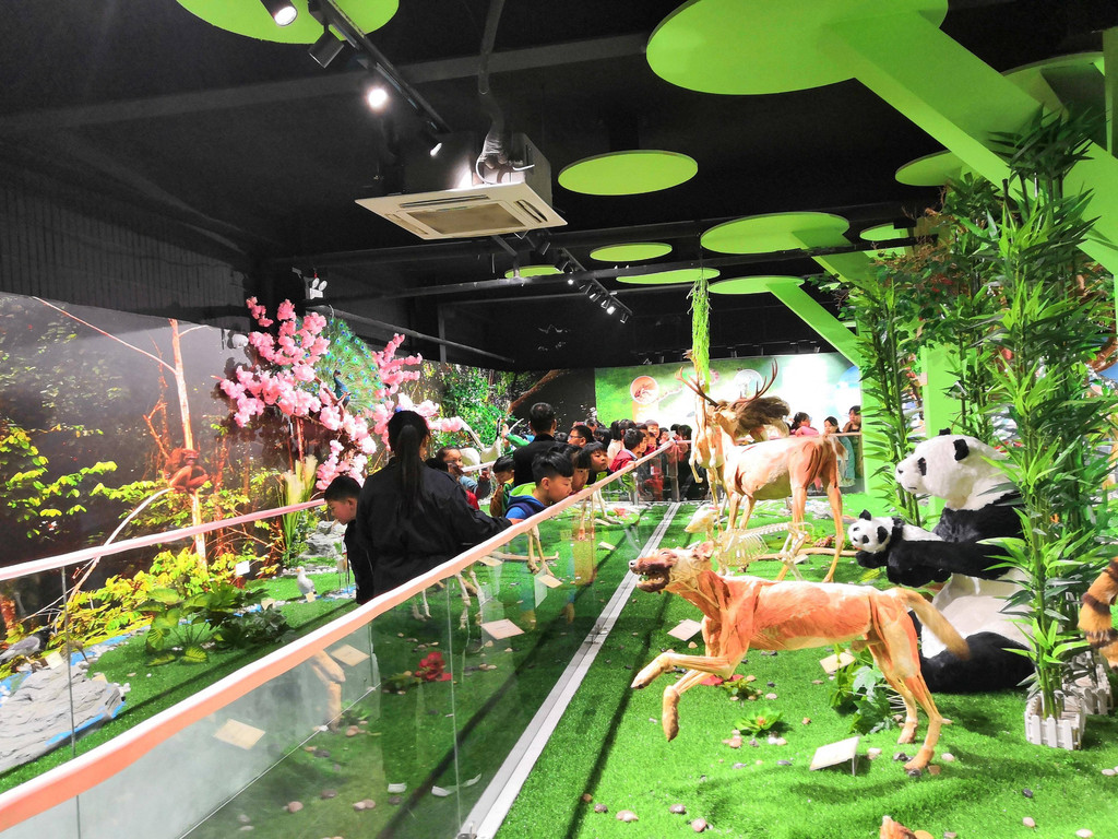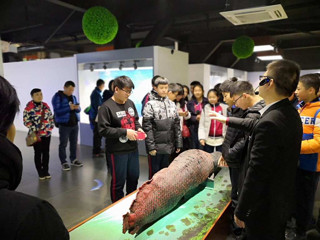动植物进化展区中展示的淡水中最大的鱼类:巨骨舌鱼,小朋友们都十分好奇,以及各类珍稀动物标本,熊猫、老虎、鳄鱼等等,仿佛进入了动物王国!