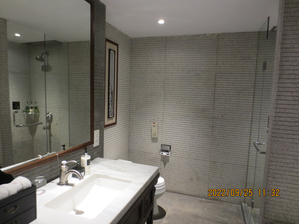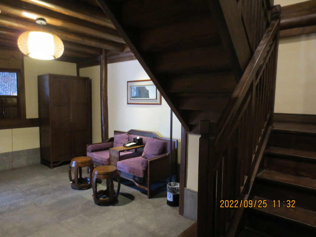 丰溢房的客房,楼下客厅,后面卫生间,楼上卧室,问了服务生这个一晚价格370元起,看了携程挂牌价400-500元。