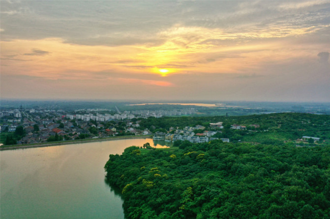 天在将黑未黑时最美,光线也最柔和,是以夕阳无限好,天空的云彩仿佛水彩画一般倒映在湖面上,而远处的茅山恰似一条巨龙静静地横卧在湖畔,一切都是美好的模样。