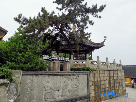 从金山山巅下来,来到金鳌岭下。古时这里有七座小山包凸起,称为七峰岭,后来削平了七峰,在平台上建了一座七峰阁。墙壁上的这幅浮雕一边刻着“金鳌岭”,一边刻着“七峰阁”。中间坐着的两位人物,一位是岳飞,另一位是金山寺的主持道月方丈。