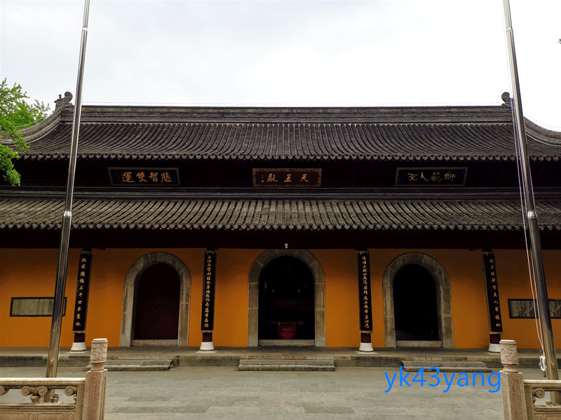 天王殿的背面,上檐下挂有三块横匾:中间那块是赵朴初先生题写的“天王殿”三个字。左边横匾题曰“师范人天”,为柳曾符敬书。右边是“悲智双运”。