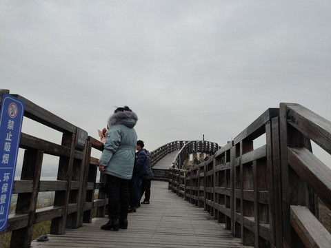 即将登顶时出现了岔路,往左还可登高,往右则是迤逦的栈道,看着似乎绵延了很远。我们估算了一下时间,还是决定登上峰顶。也有一些游客沿着栈道前行,不过大多数人还是选择继续攀登,峰顶的那座高塔像是有些历史的。