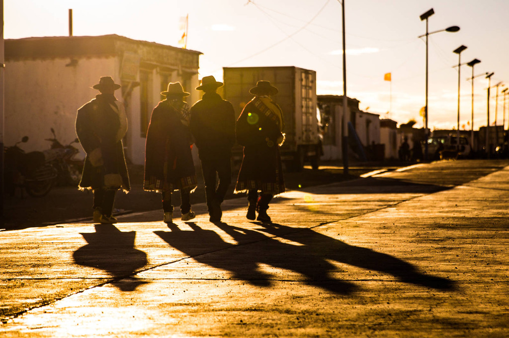 马上就要进入寒冷的夜晚,仁多乡的藏民们吃好晚饭,穿好传统盛装,聚集到唯一的街上,散步、寒暄或交谈,享受一天中最轻松最温暖的时刻,海拔4800米浓烈的斜阳,将他们的身影拉长,像电影里的一段段。
