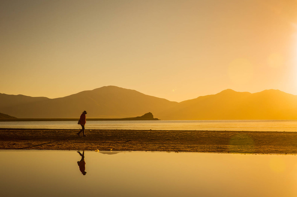 在仁多乡的西北边有一个昂拉仁错,是微咸水湖,湖面积560平方千米,我没有找到路。东边是出名的仁青休布错,早上仁多出发玻璃上结了厚厚的霜,穿过无人的草原翻过一个山口,朝阳下雪山倒影,湖水金光,仁青休布错像一幅巨大的油画,惊艳的阿里中北环线一错再错拉开大幕。