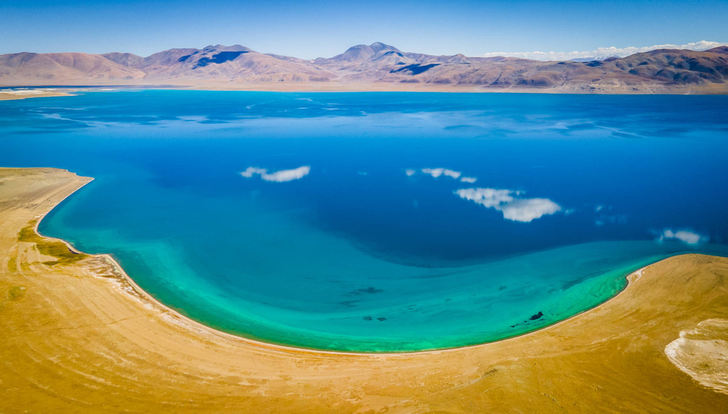 最后从扎布耶错向南是塔若错,名气不大,却有一个出圈的观景台。湖岸伸出一座乱石山,登上山颠,清风拂来,白云倒映的蓝湖尽收眼底,还有一片视线很毒的湖面半月形角度。这些美景都在仁多乡范围,从乡中心出发只要3小时左右的车程。