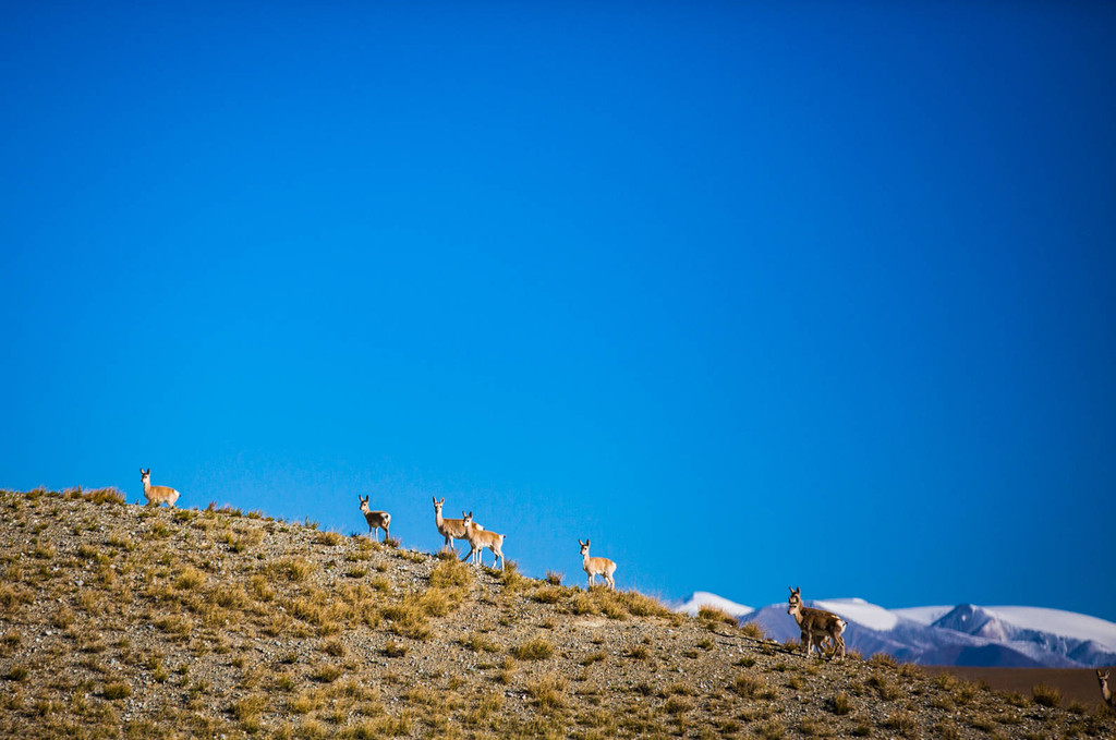 接下来是藏民牧场和野生动物草场的交织地带,而且野生动物越来越多了,你可以经过一个山岗,与藏原羚对望。