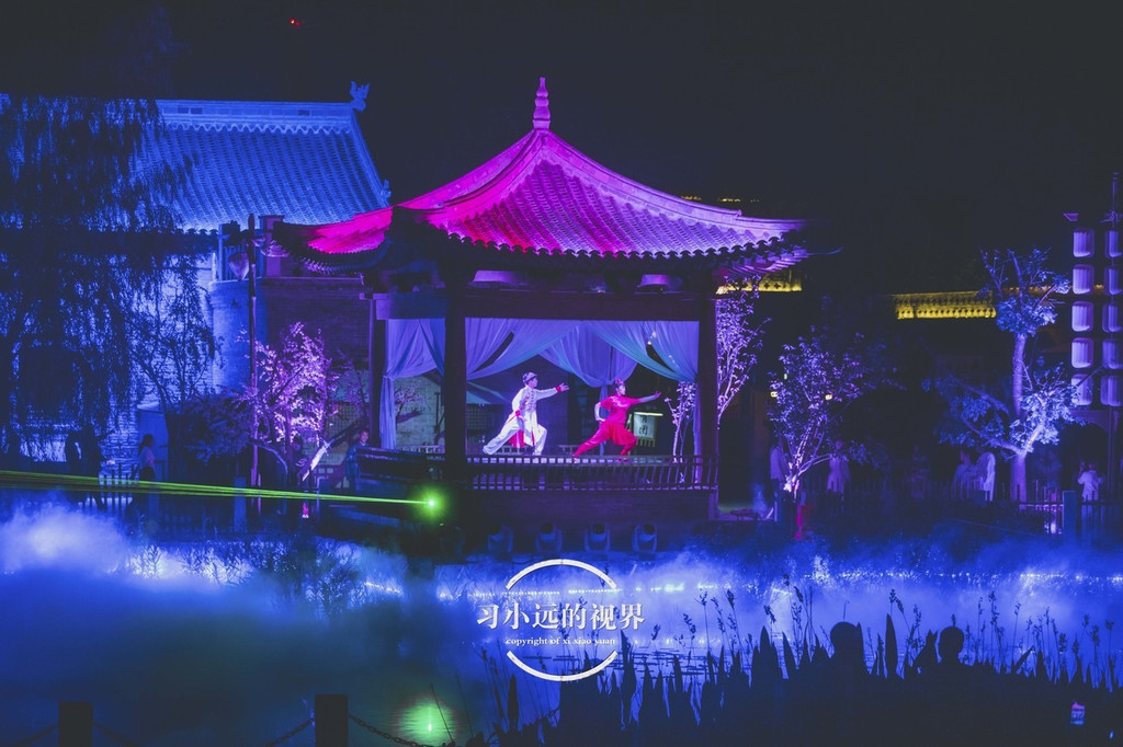 《战太极》是一场更宏大的实景表演,有观众的看台和专门的表演产地和道具,场上演员看着足足有个五六十人吧,以一个说书先生的口吻来讲述一个关于杨露禅和玉娘大婚之日被官兵围杀的故事。